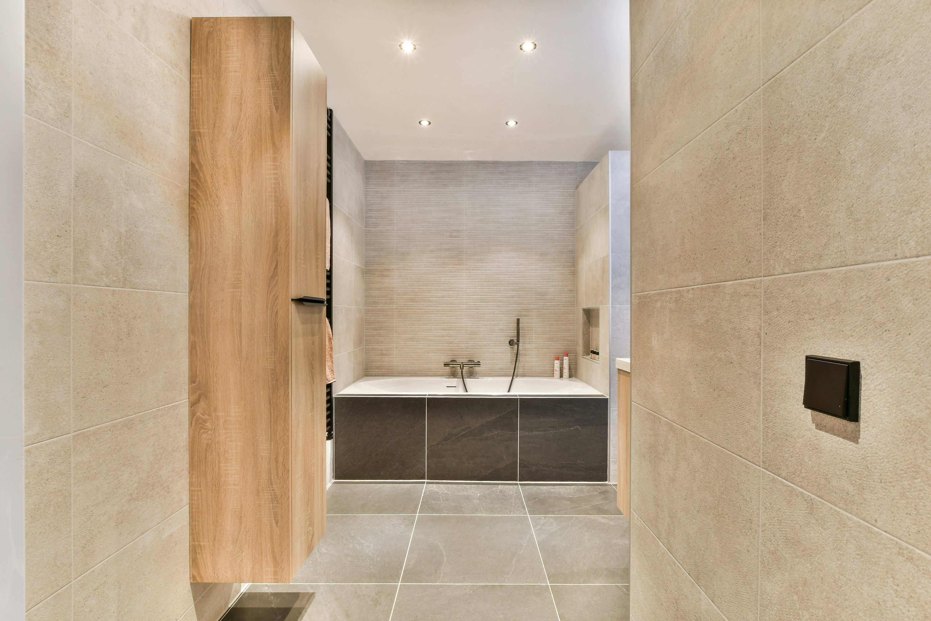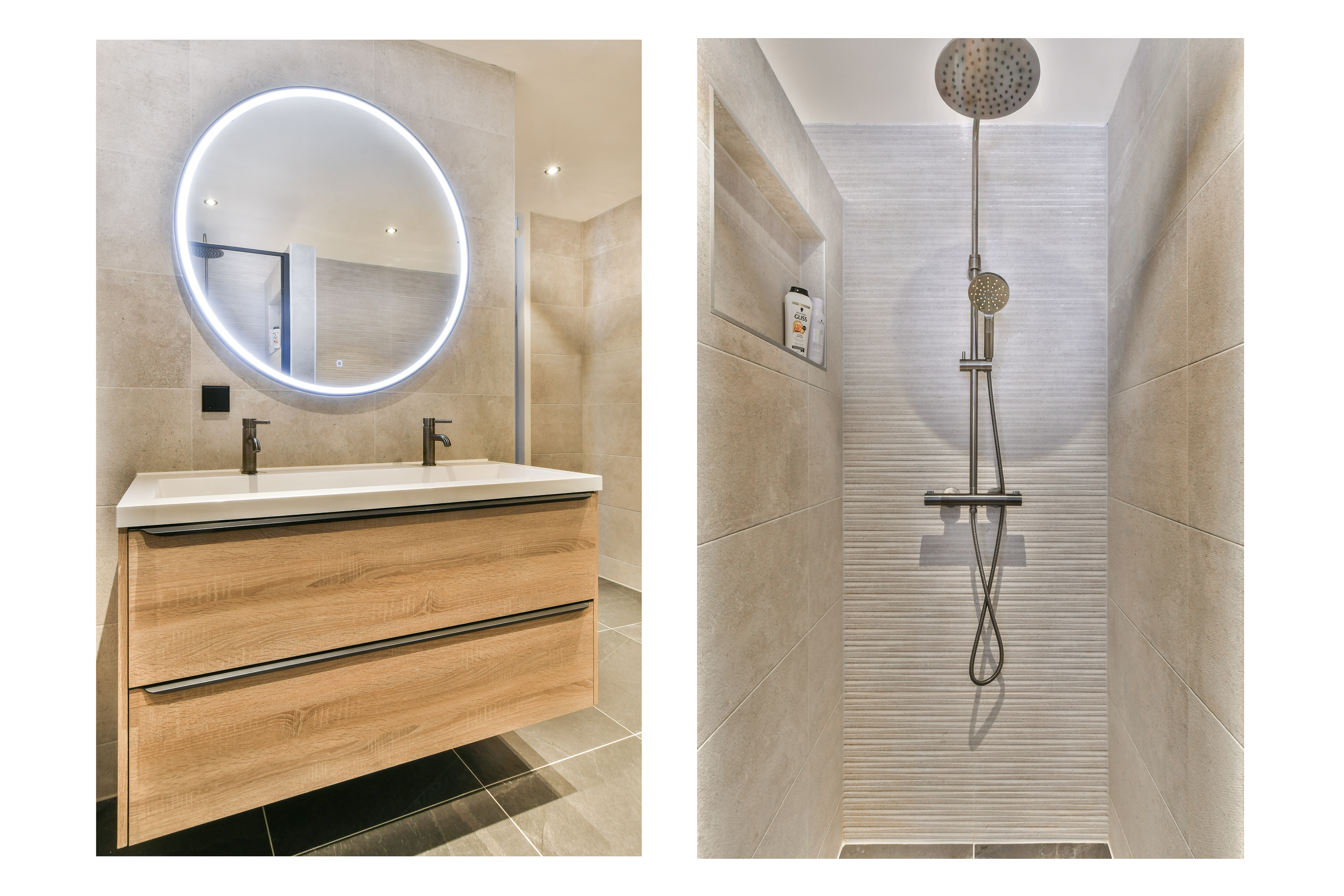 is voorzien van een ligbad, inloopdouche, dubbel wastafelmeubel, extra bergruimte en een grote ronde spiegel. Daarnaast is er een separaat toilet met fonteintje.