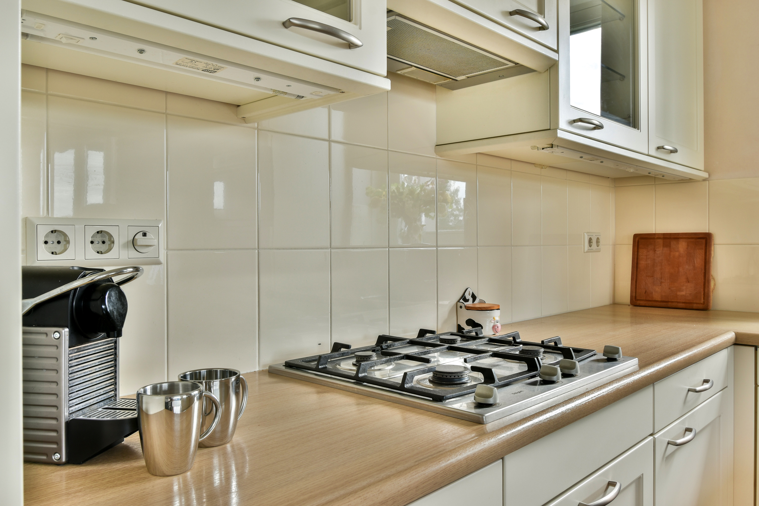 De open keuken sluit naadloos aan op de woonkamer en is voorzien van diverse inbouwapparatuur, waaronder een koelkast, combi-oven, vaatwasser, gaskookplaat met afzuigkap, en een handige apothekerskast.