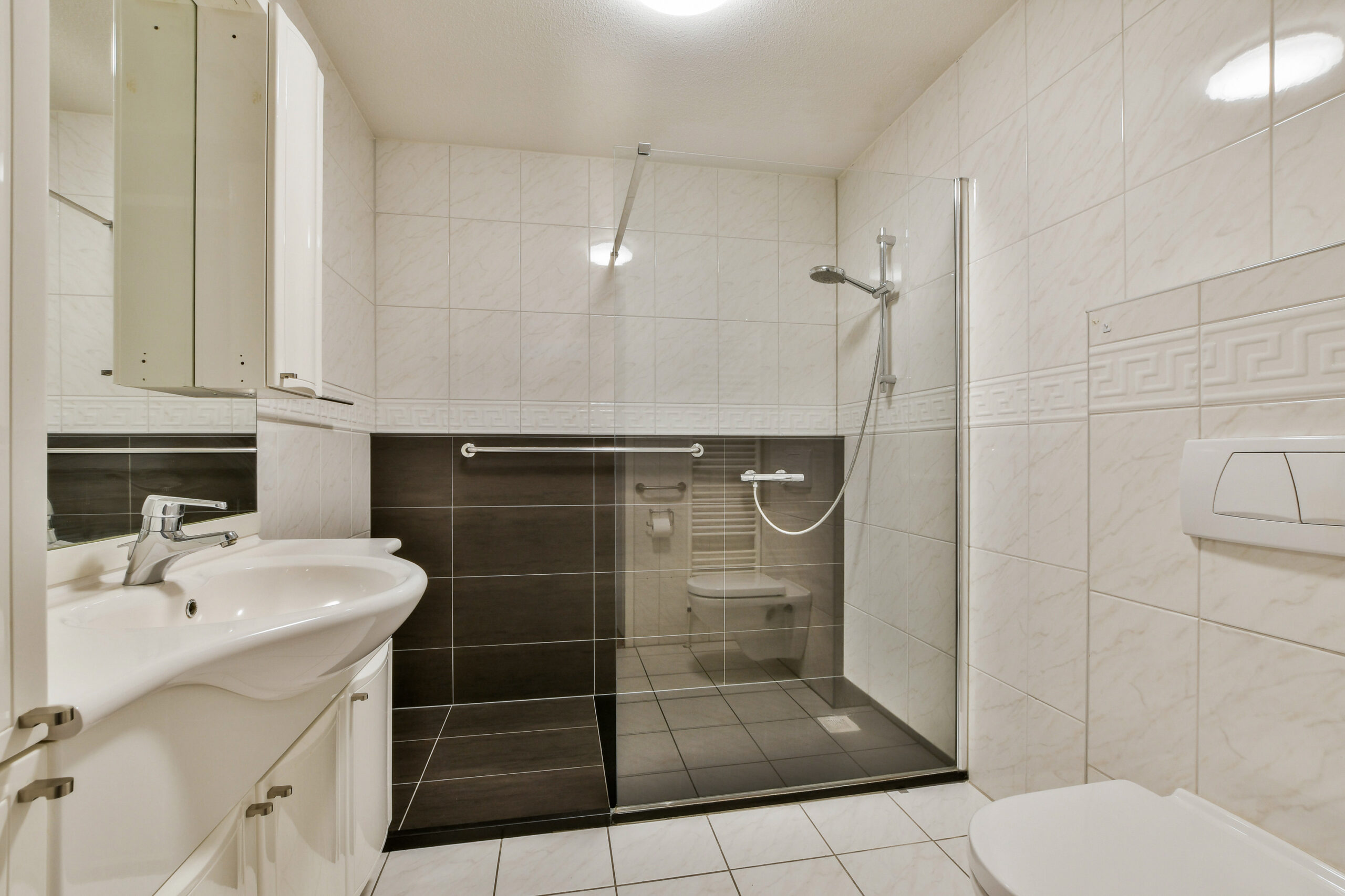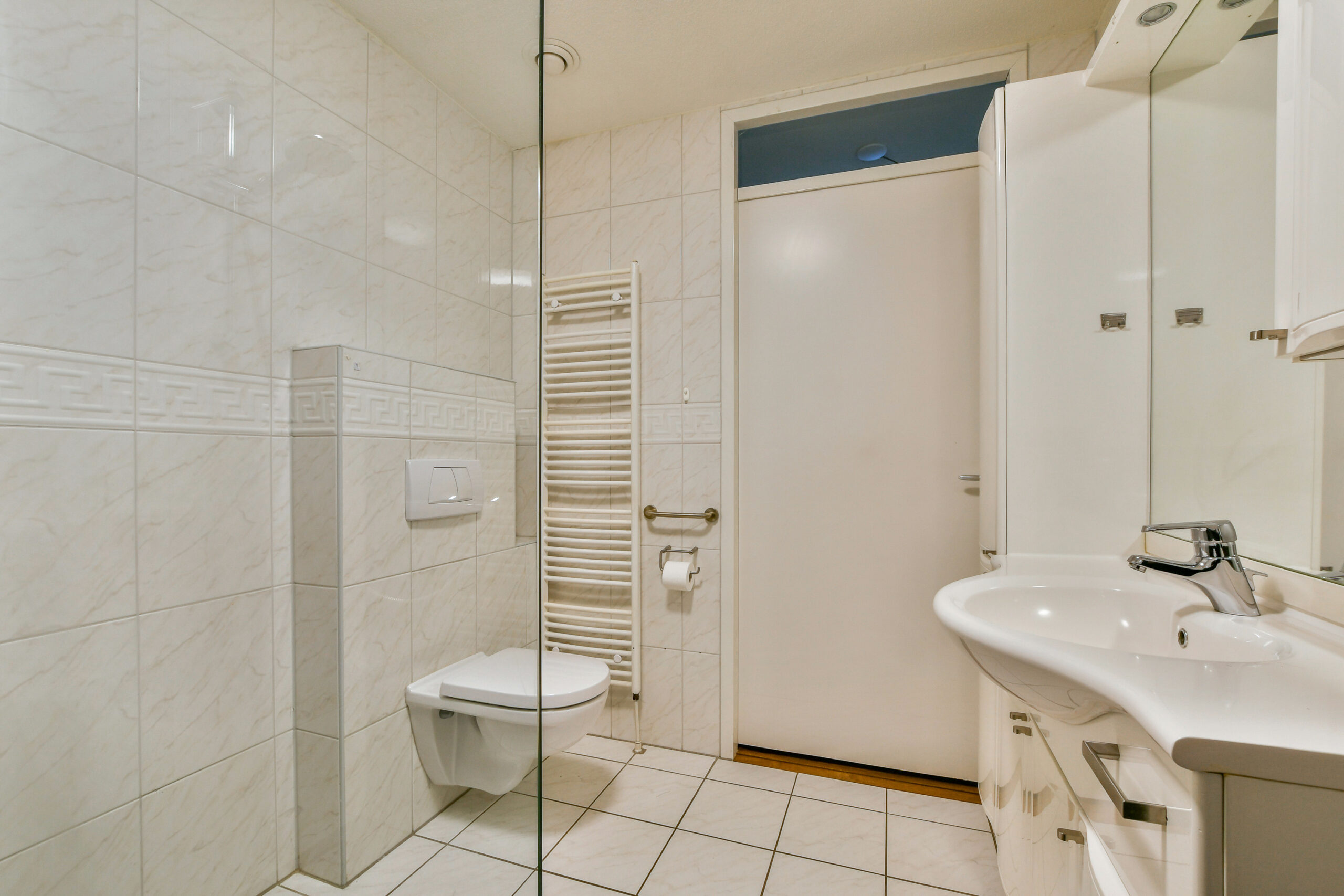 In de ruime badkamer is de vloer afgewerkt met plavuizen. Voor optimaal comfort is er een ruime inloopdouche, wastafelmeubel, toilet en design radiator aanwezig.