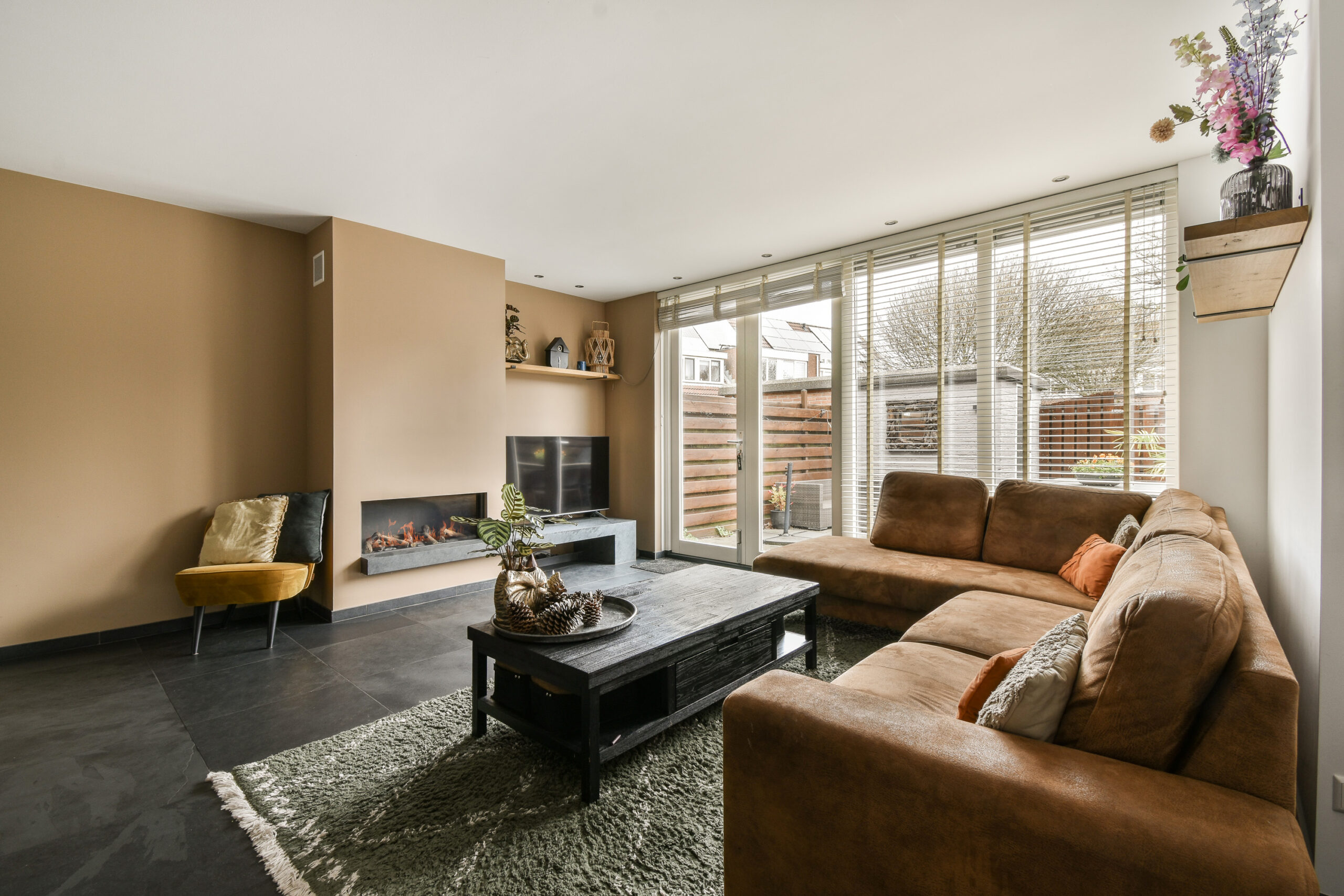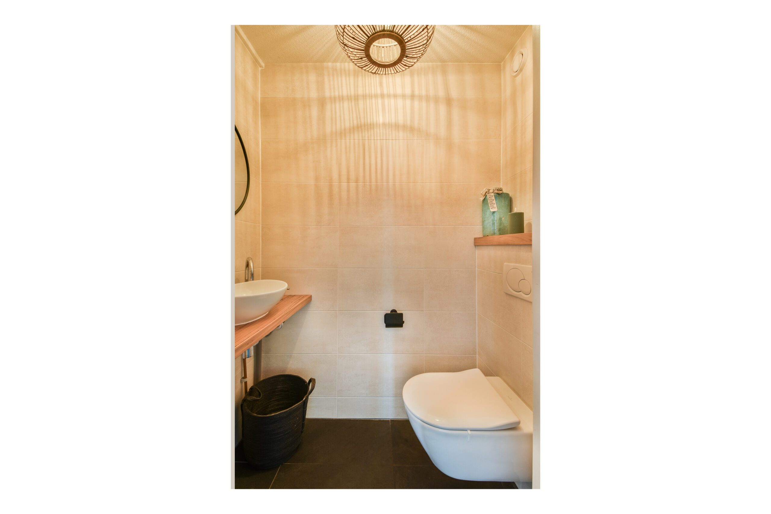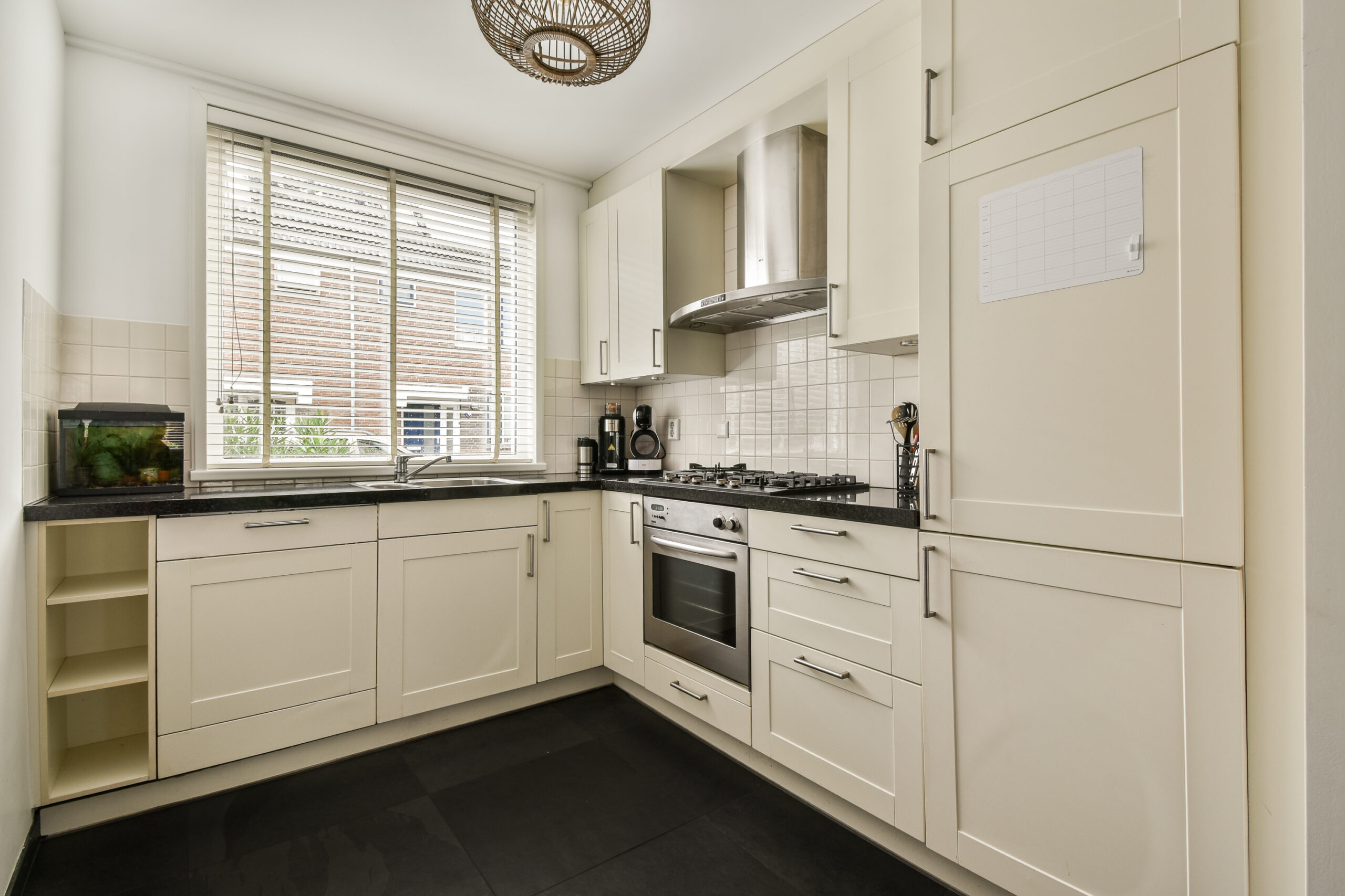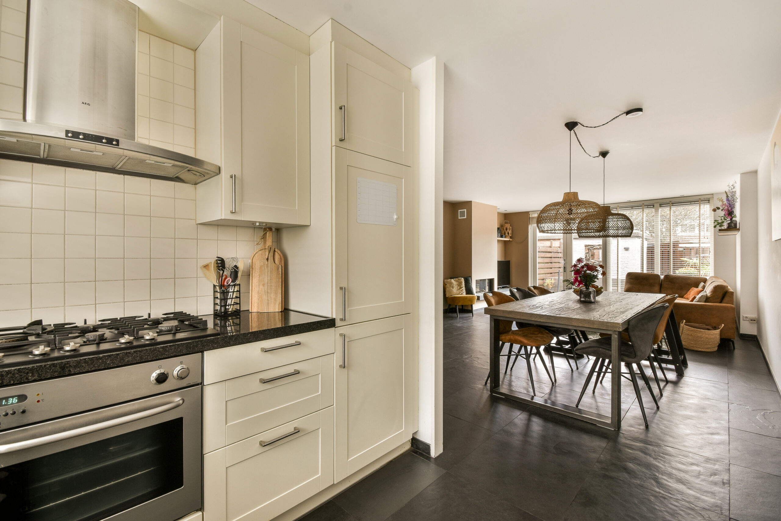 en plafonds zijn strak gestuukt en uitgerust met moderne inbouwspots. Aan de voorzijde bevindt zich de halfopen keuken in hoekopstelling, voorzien van een natuurstenen werkblad, 5-pits gasfornuis, oven, vaatwasser, koelkast, vriezer en afzuigkap. Alle binnendeuren zijn vernieuwd en passen perfect bij de moderne uitstraling.