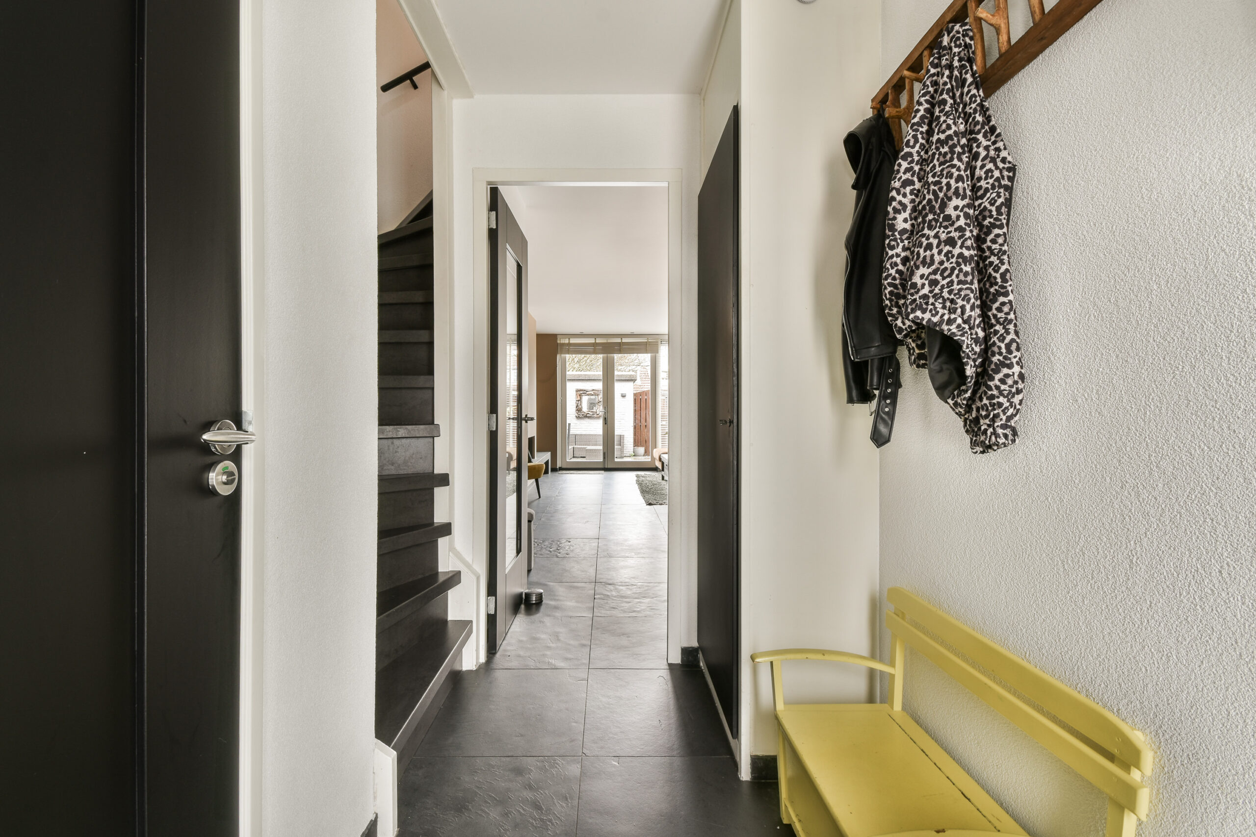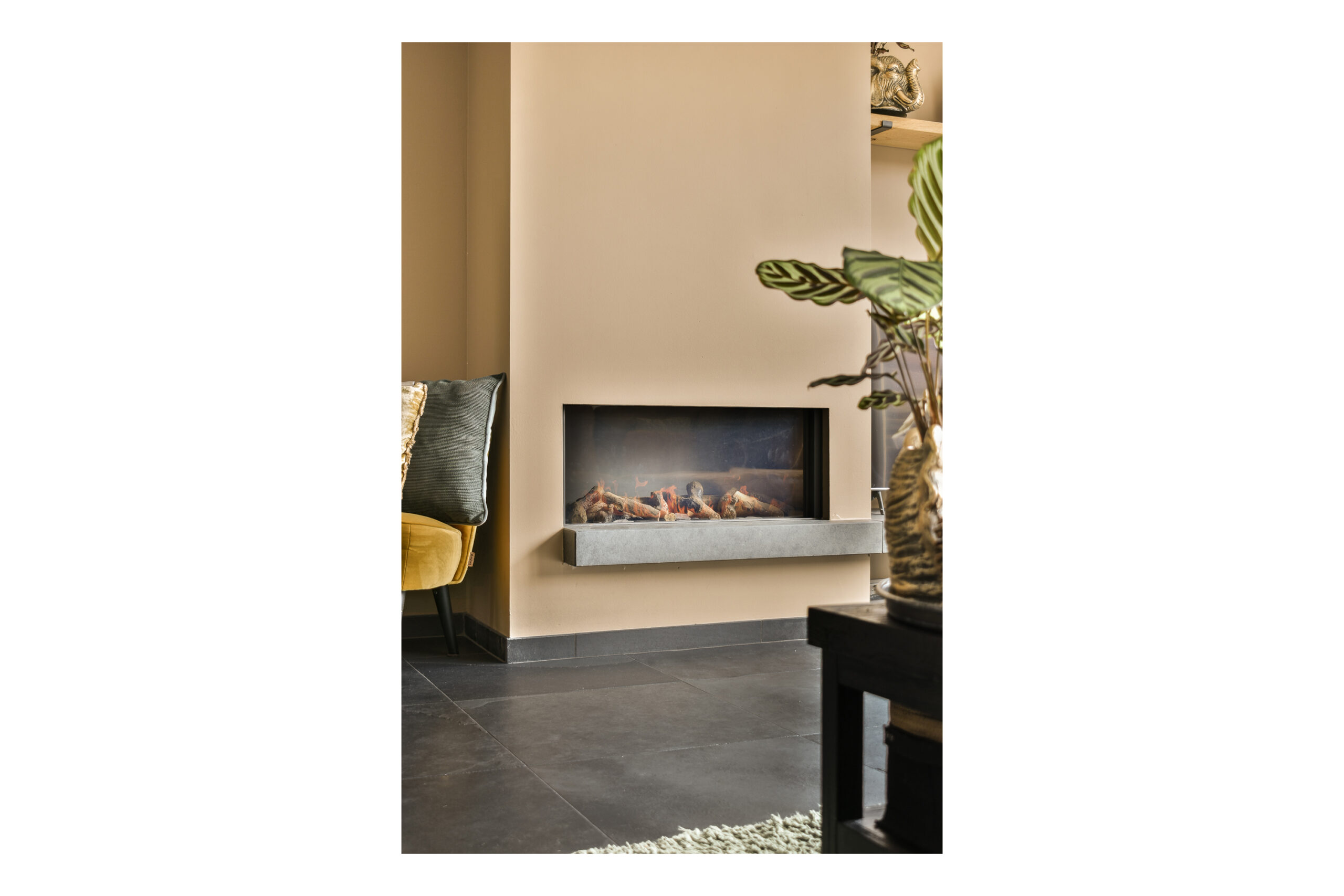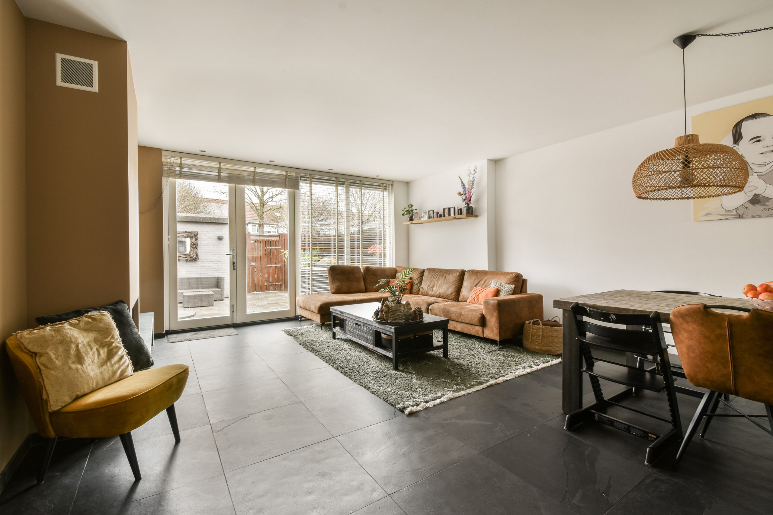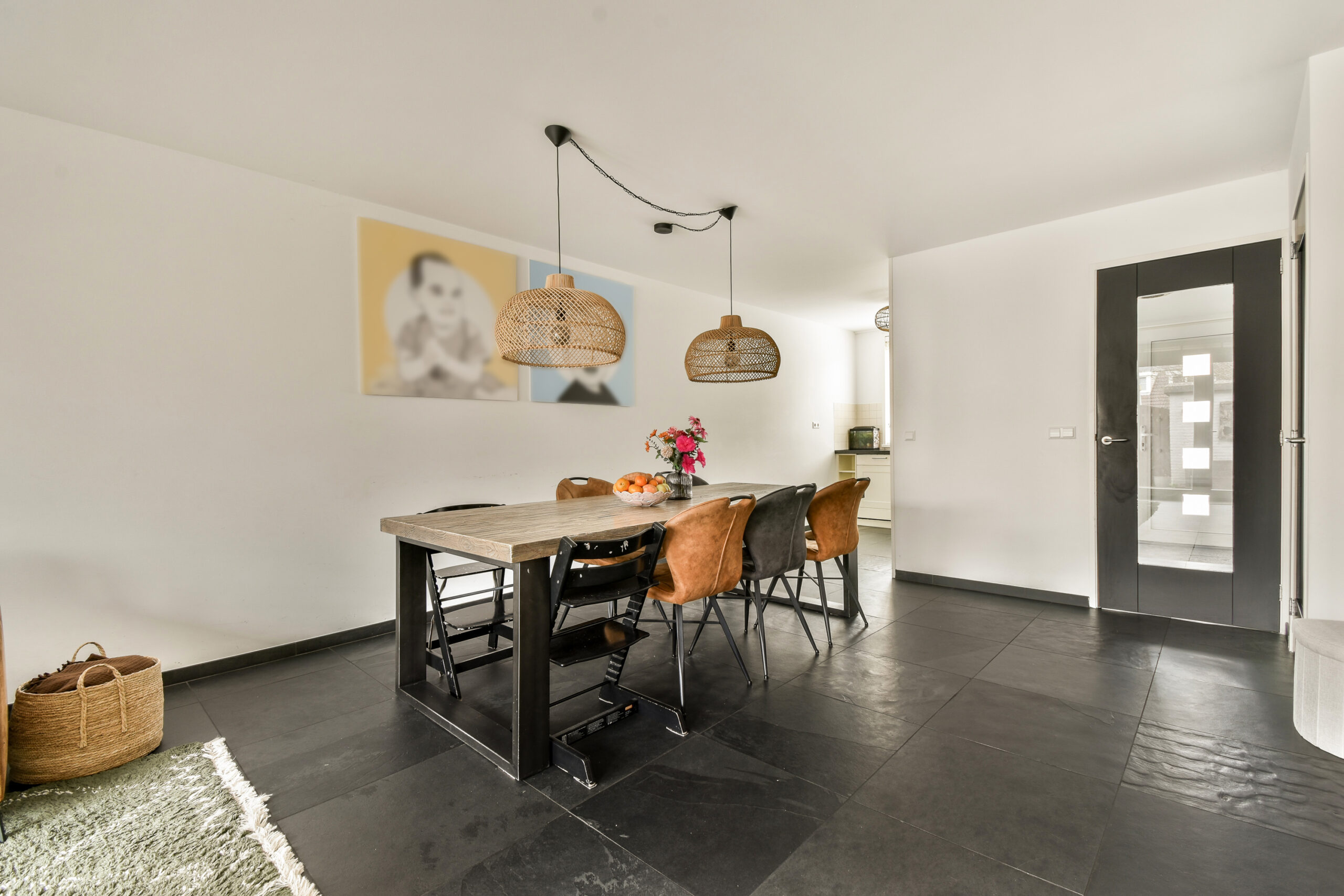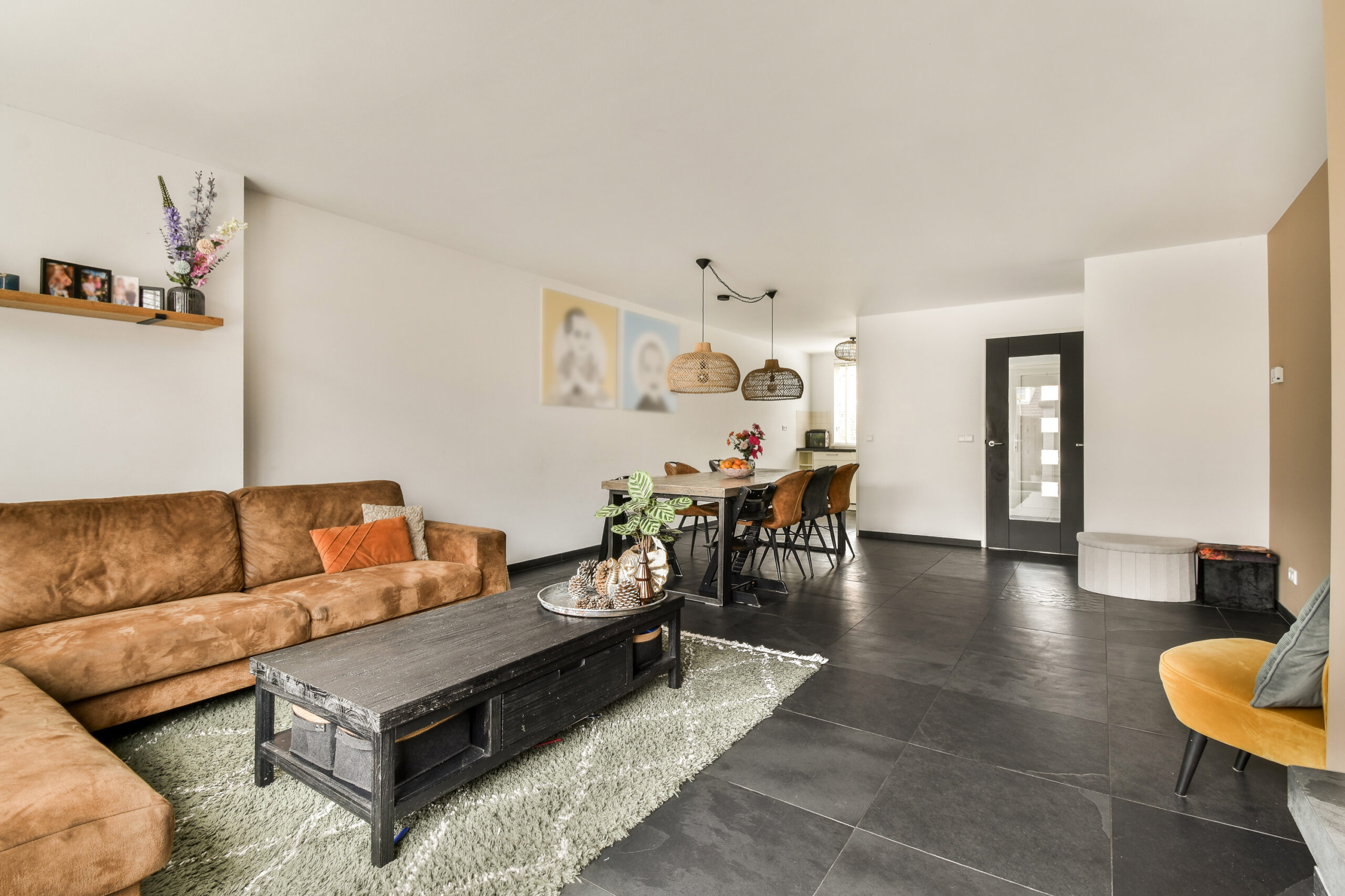 en plafonds zijn strak gestuukt en uitgerust met moderne inbouwspots. Aan de voorzijde bevindt zich de halfopen keuken in hoekopstelling, voorzien van een natuurstenen werkblad, 5-pits gasfornuis, oven, vaatwasser, koelkast, vriezer en afzuigkap. Alle binnendeuren zijn vernieuwd en passen perfect bij de moderne uitstraling.