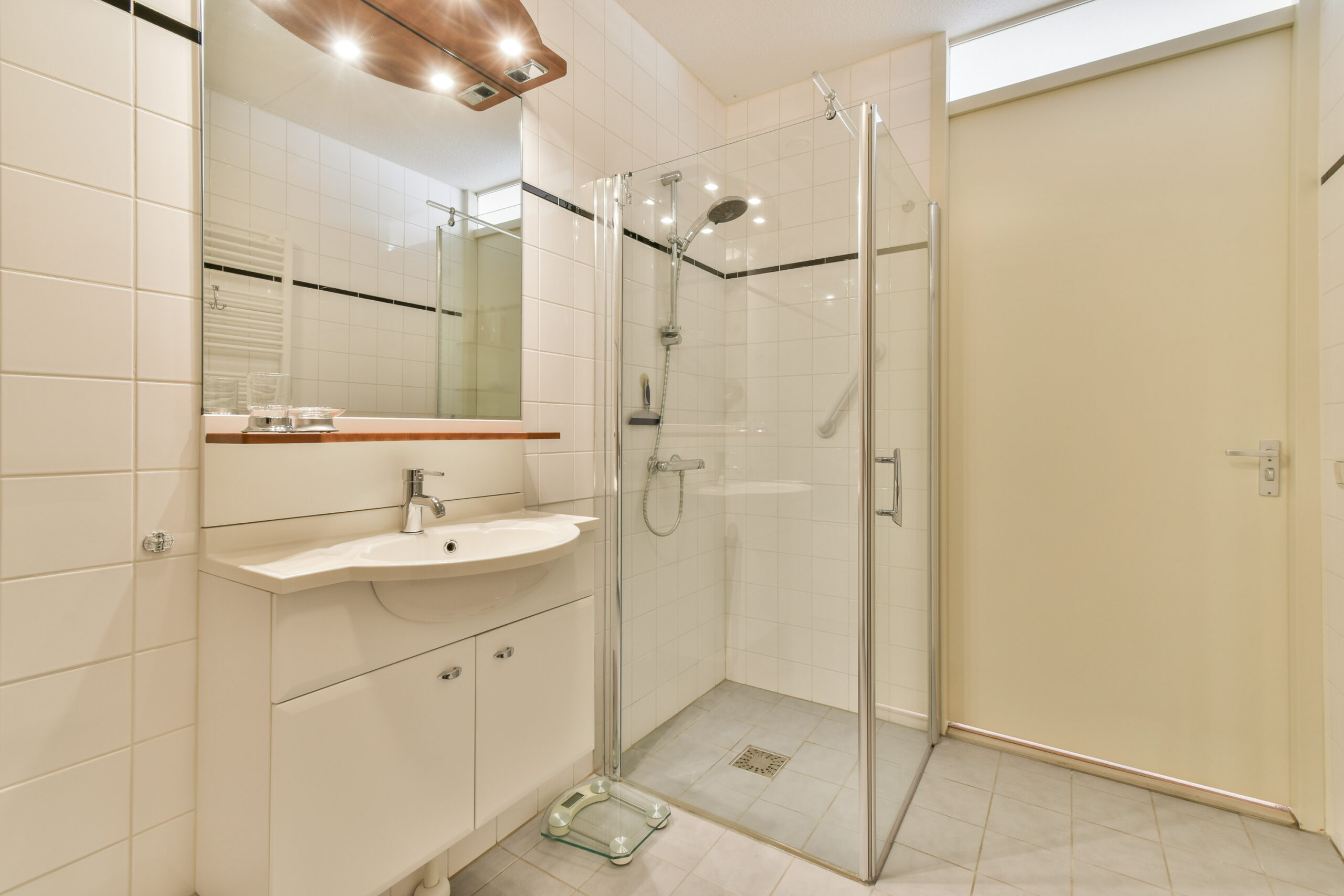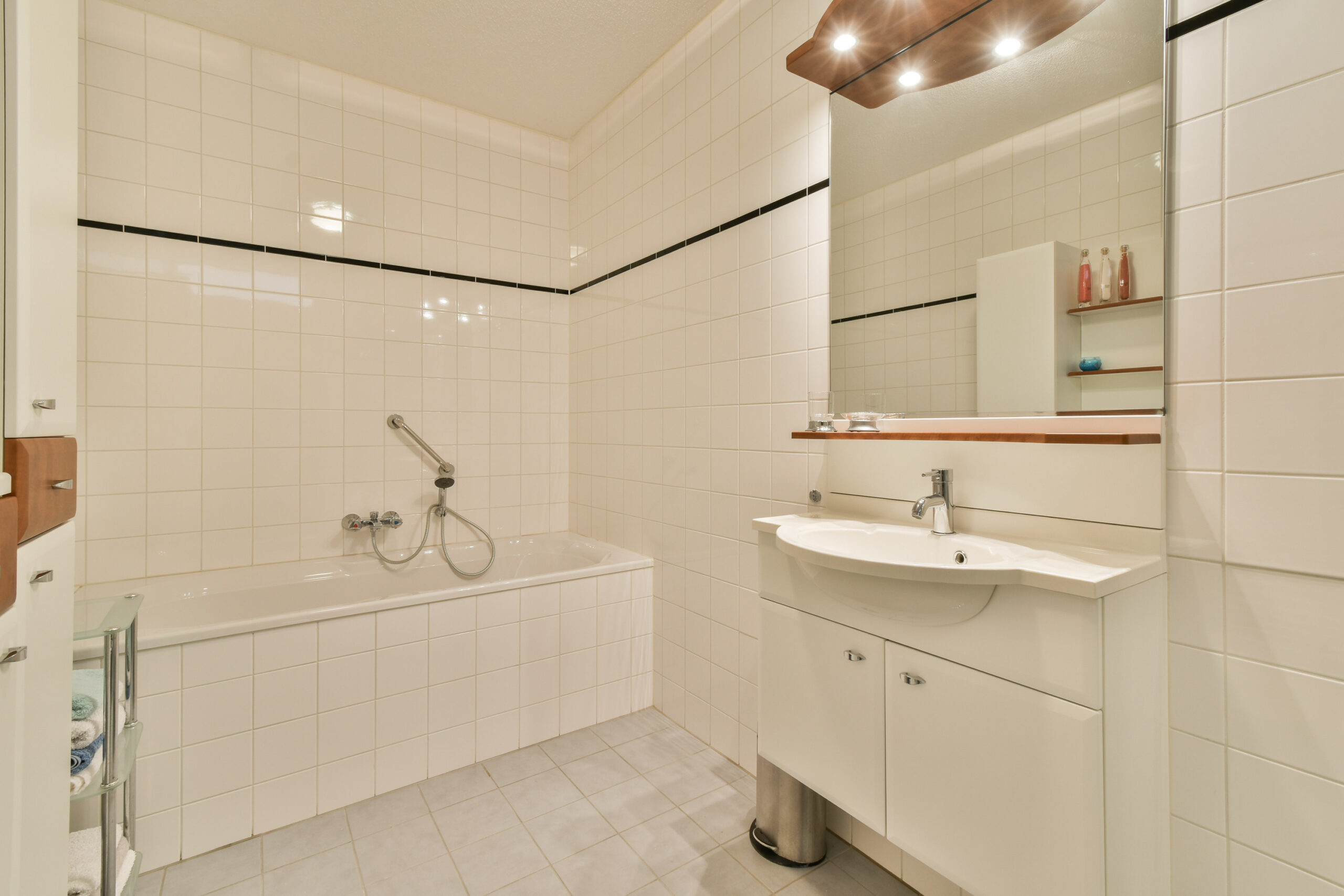 nog een grote, moderne badkamer welke voorzien is van een ligbad, inloopdouche, wastafelmeubel, handdoekradiator en een kast. Zowel de muren als de vloer zijn afgewerkt met lichte tegels.