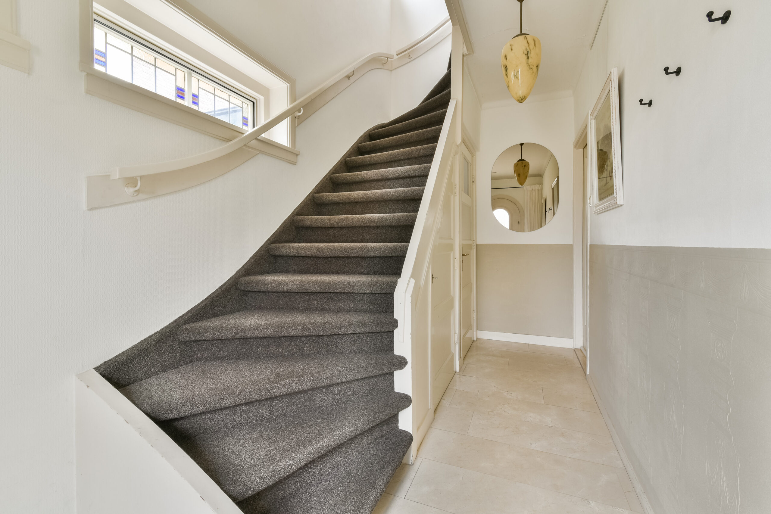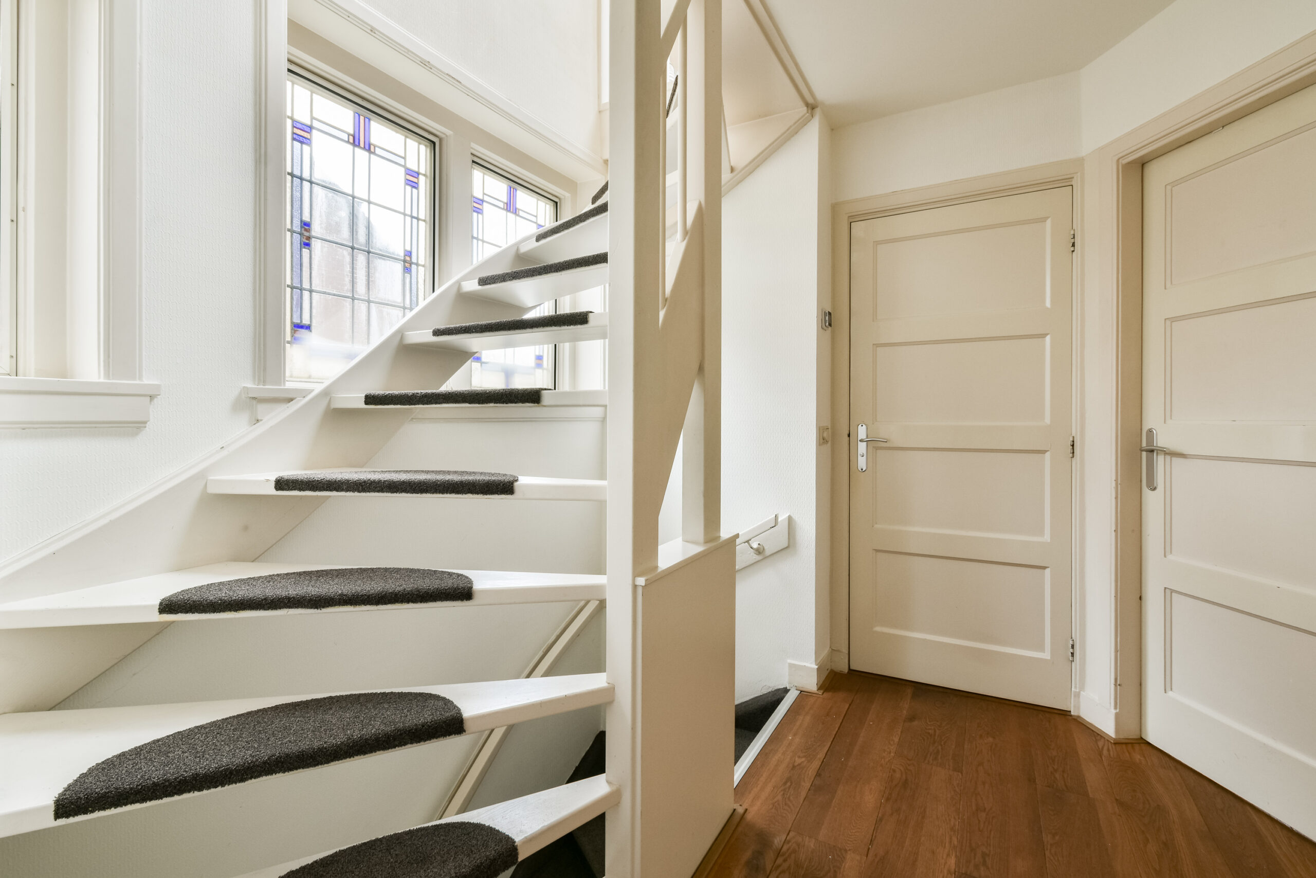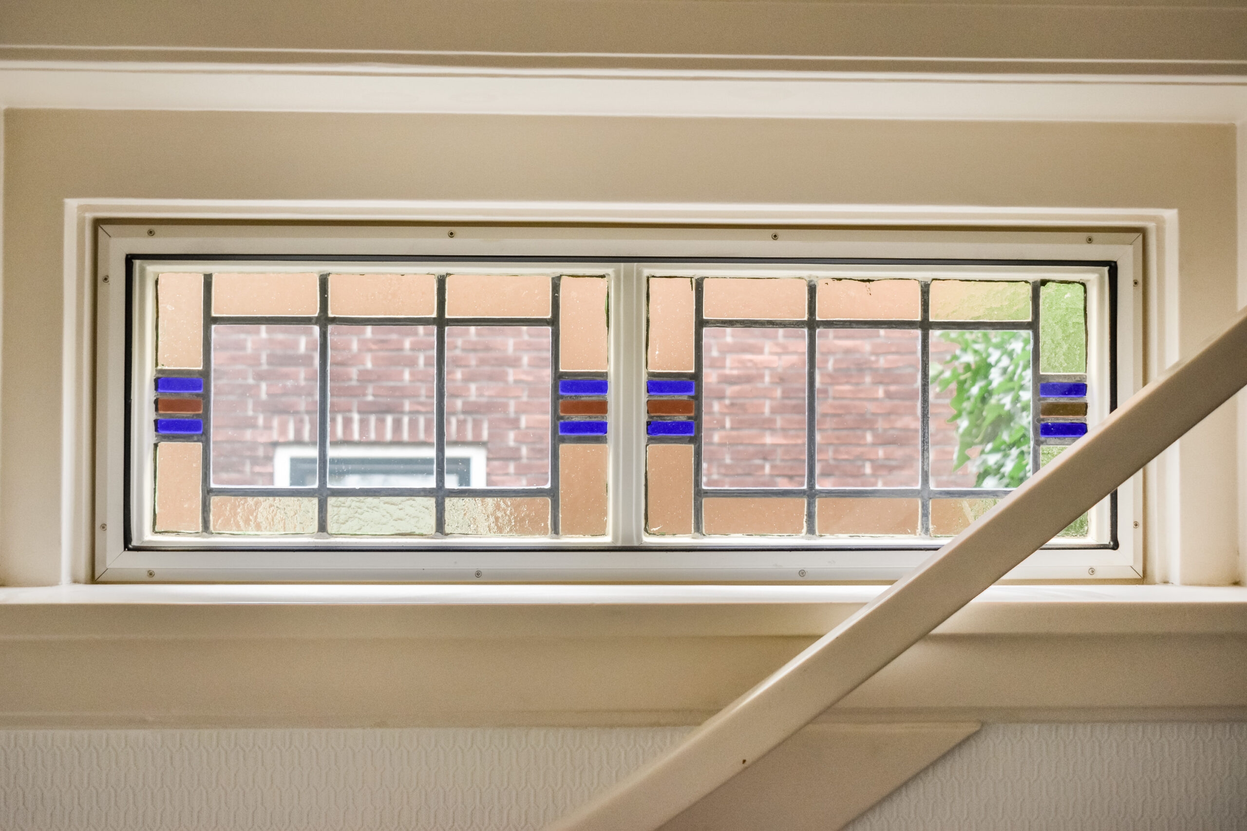 Overloop met prachtige glas-in-loodramen die zorgen voor een warm en speels lichtinval. Vanaf de overloop bereikt u de badkamer en drie slaapkamers.