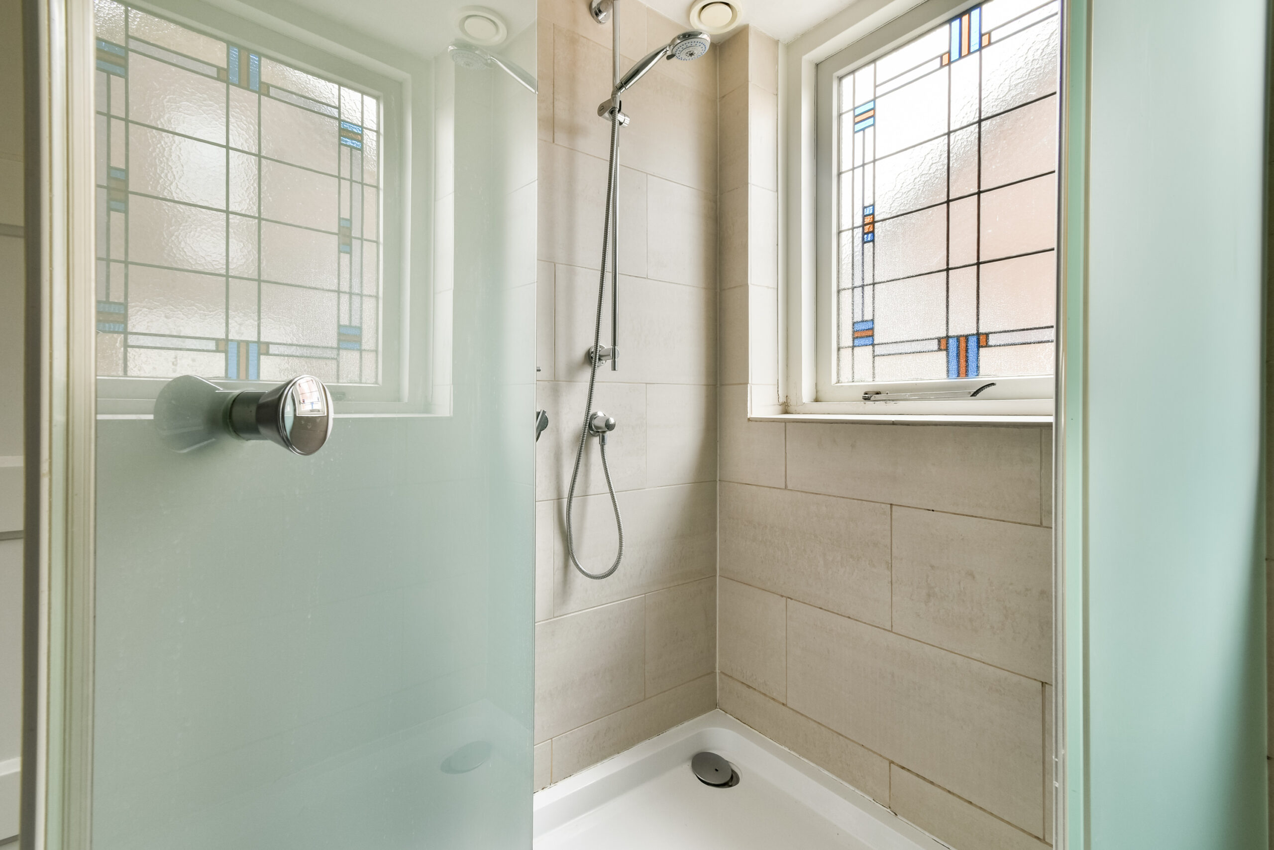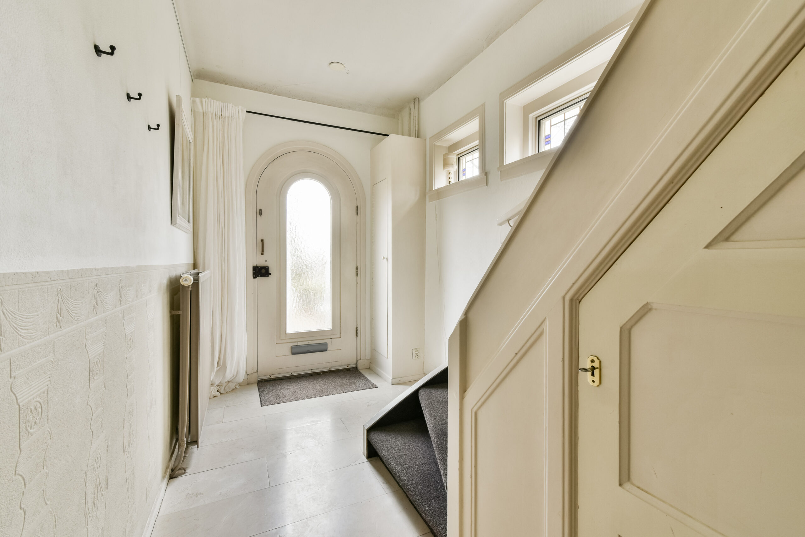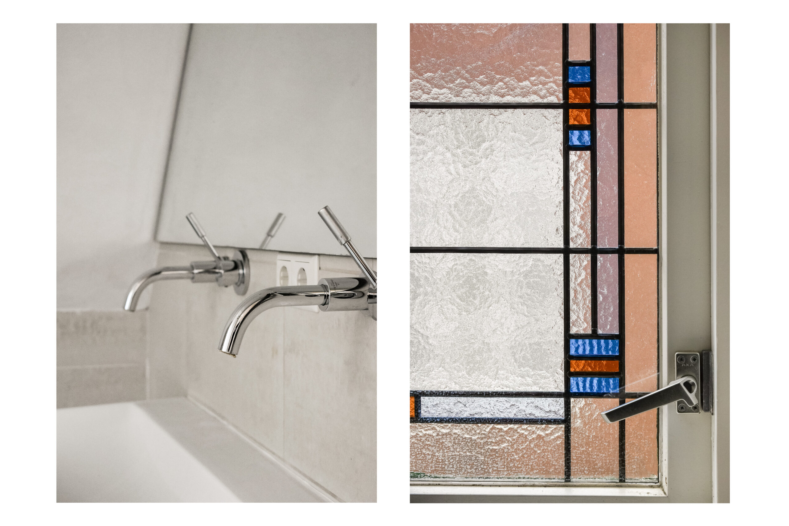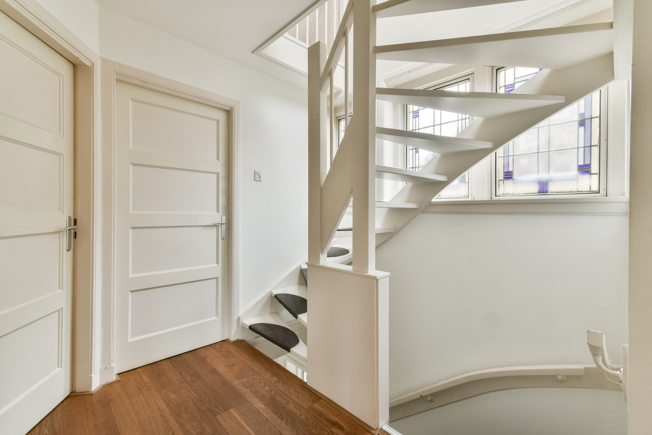 Overloop met prachtige glas-in-loodramen die zorgen voor een warm en speels lichtinval. Vanaf de overloop bereikt u de badkamer en drie slaapkamers.