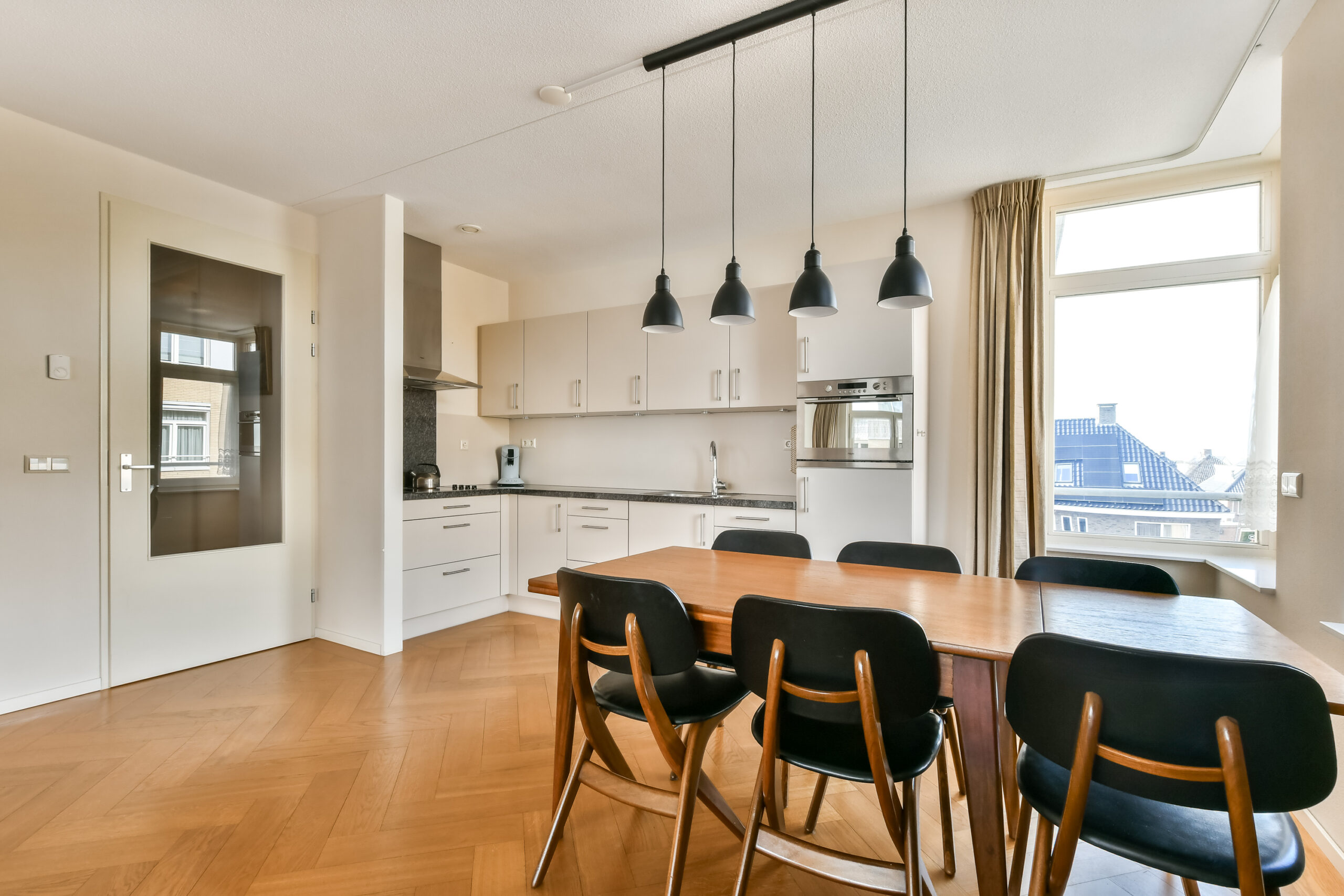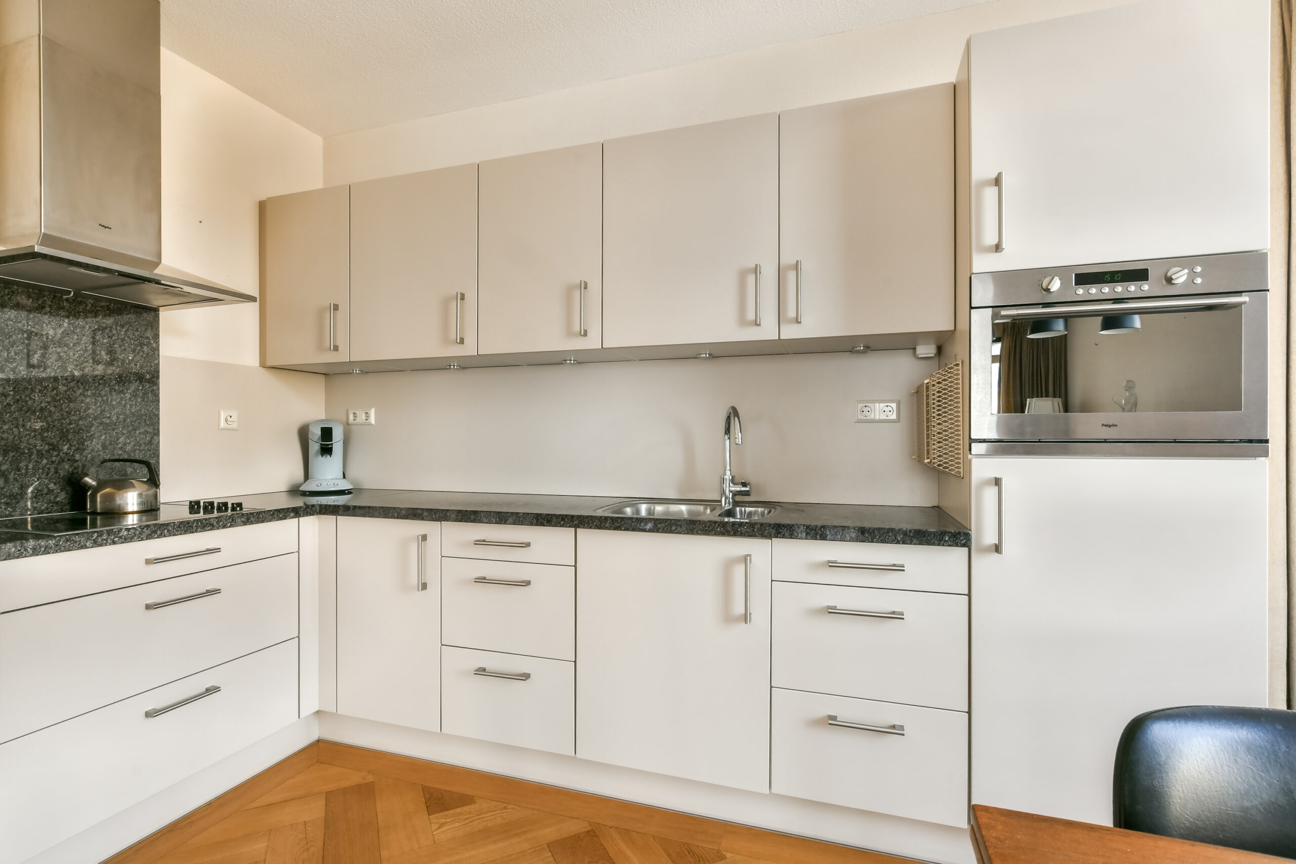 De woonkamer vormt het hart van het huis: een open, lichte ruimte met visgraat houten vloer die naadloos overgaat in de keuken. Deze is uitgerust met een koelkast, 4-pits kookplaat, afzuigkap en magnetron – ideaal voor culinaire creaties.