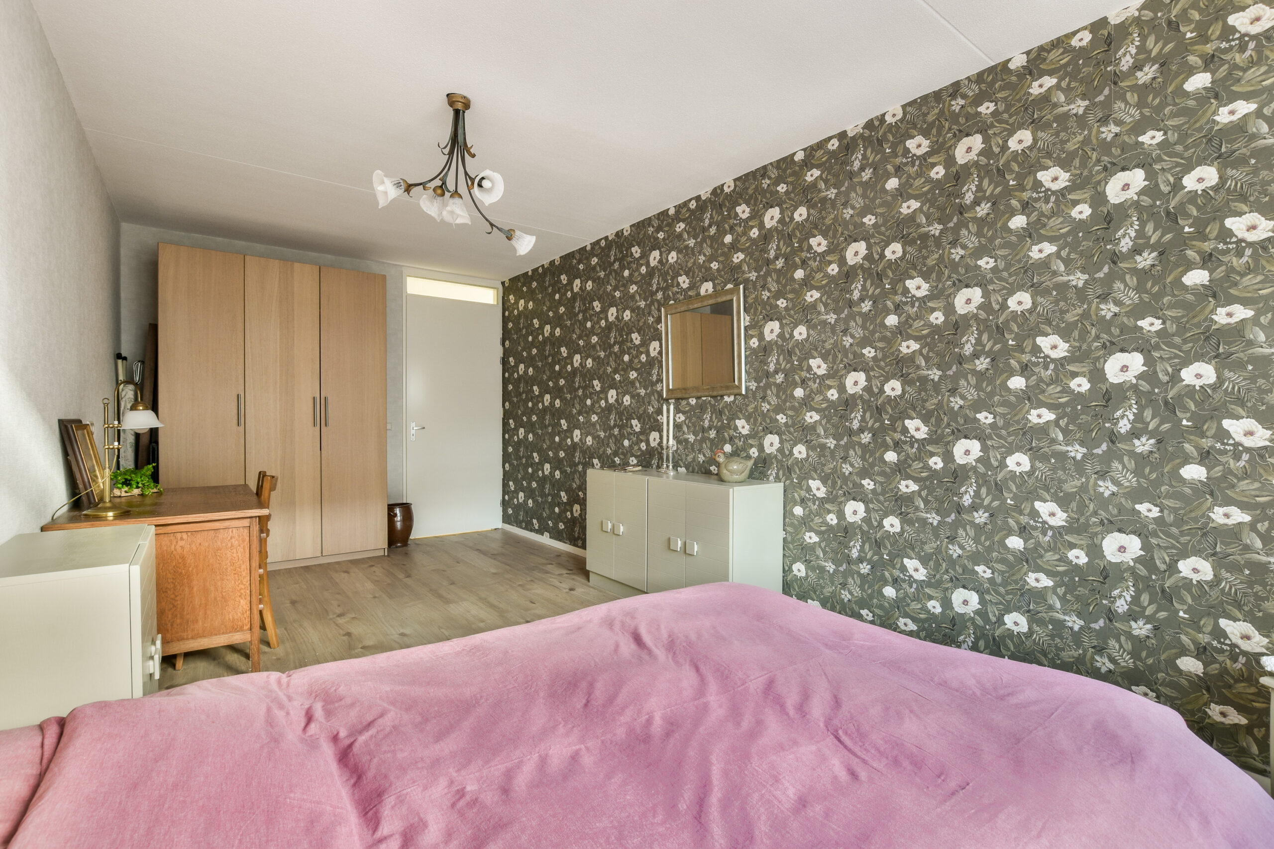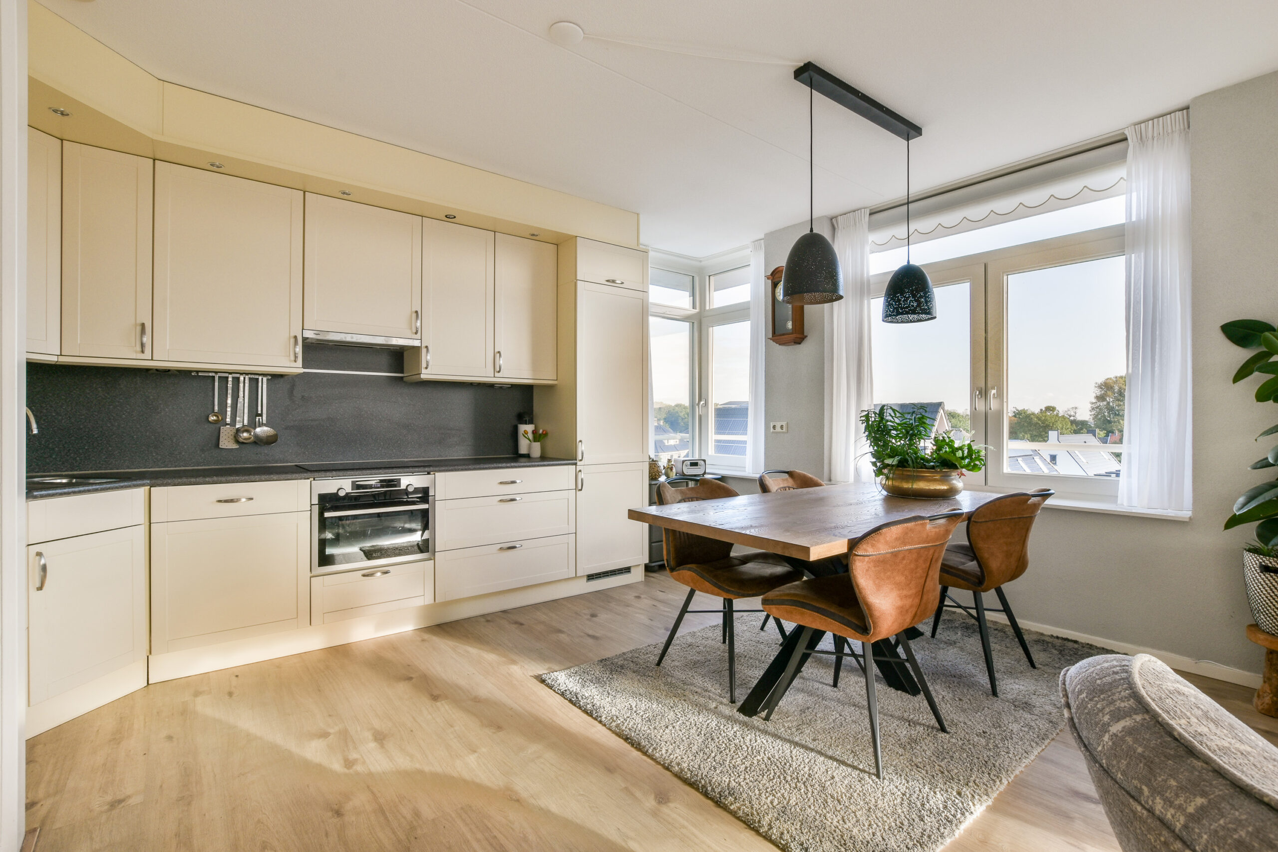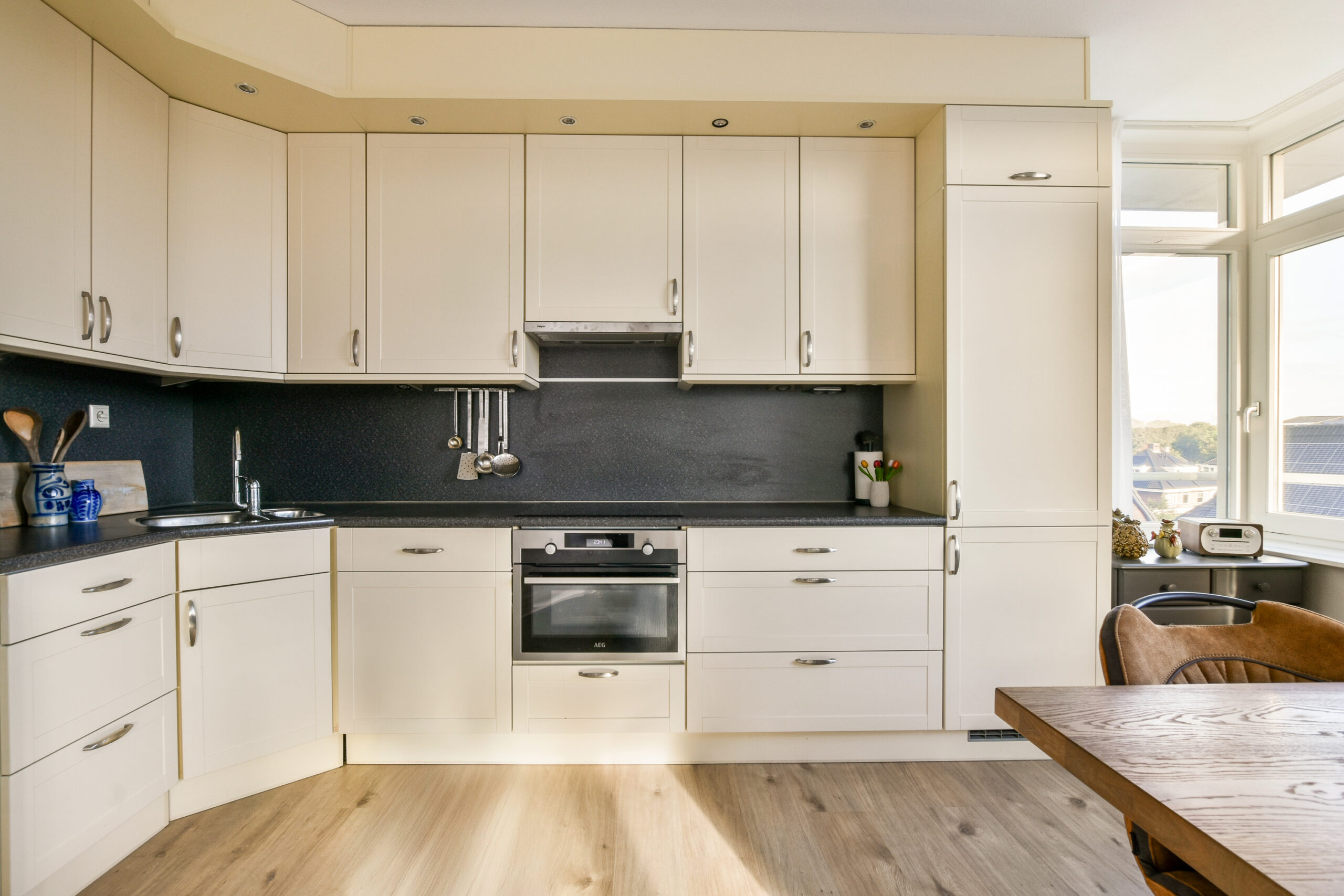 De eerste slaapkamer is van goed formaat en voorzien van een screen. De tweede slaapkamer is eveneens licht en biedt toegang vanuit de woonkamer. De woonkamer is een lichte en open ruimte, die direct in verbinding staat met de moderne keuken. Deze keuken is volledig uitgerust met een koel-/vriescombinatie, een 4-pits kookplaat, een afzuigkap en een combioven.