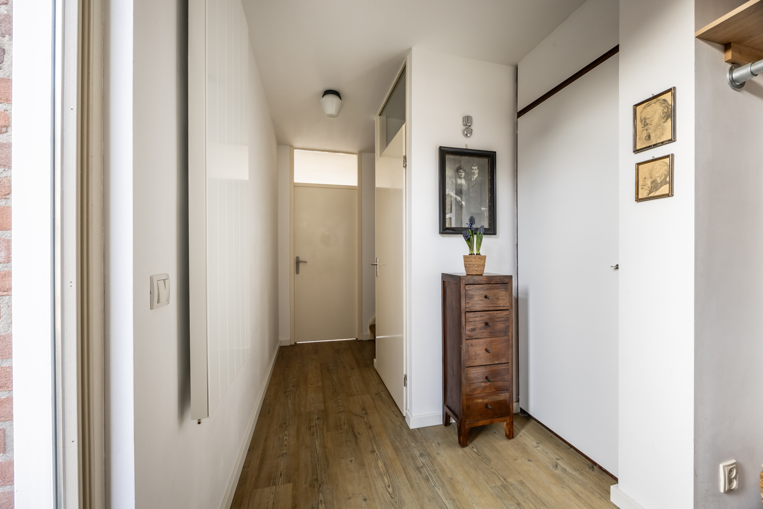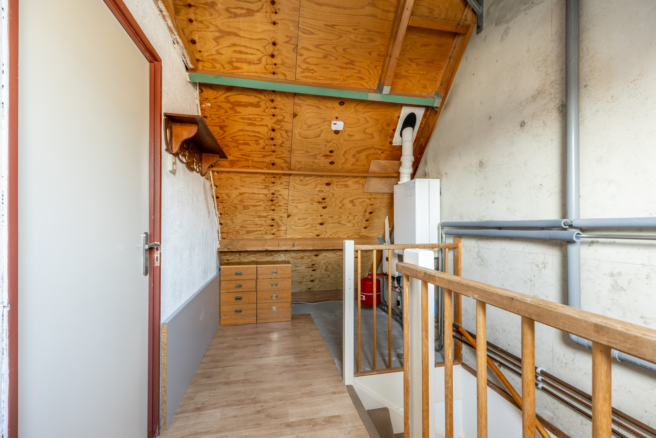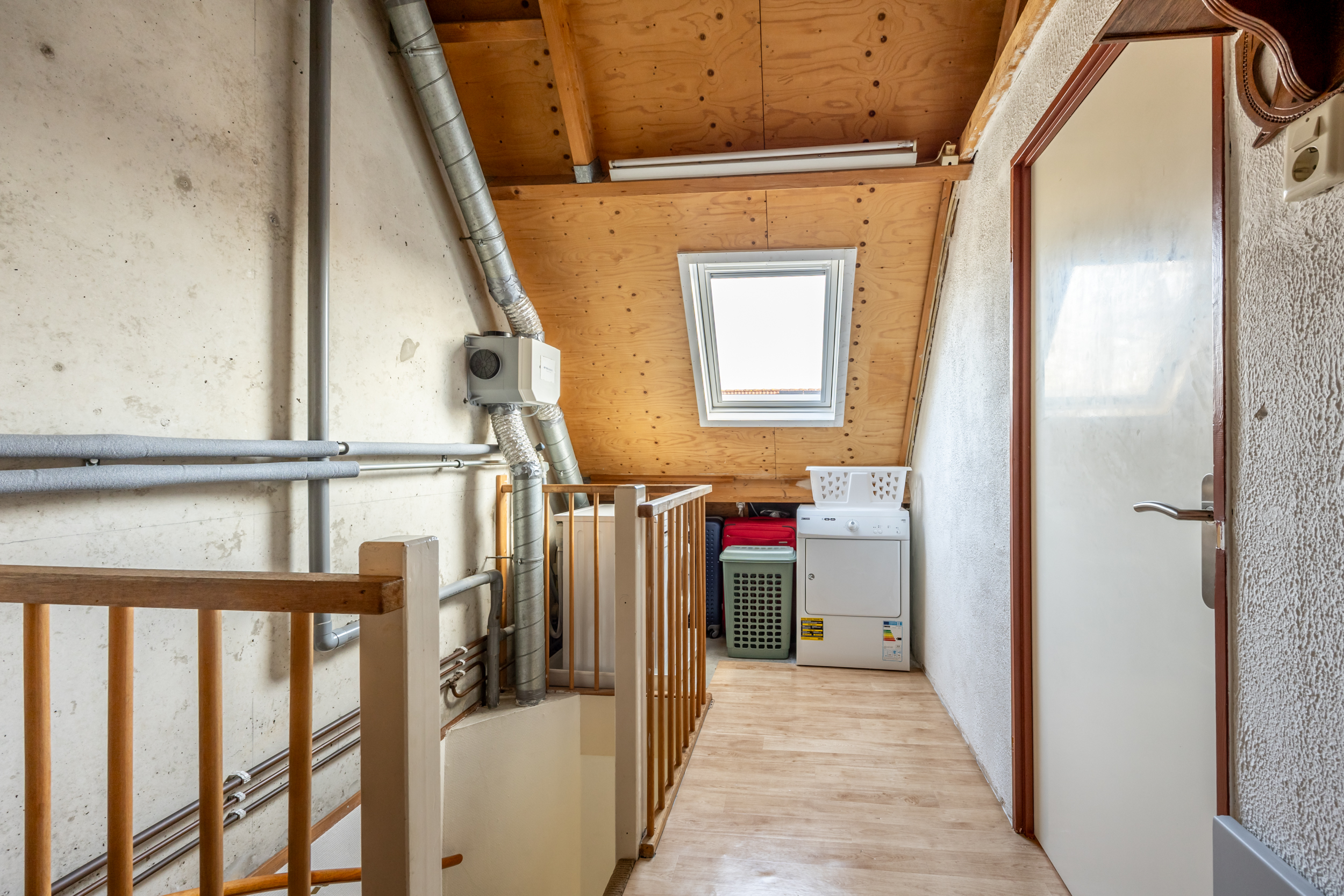 Loop je de trap verder op dan kom je op de tweede verdieping met veel opbergruimte achter de schotten, C.V.-ruimte, , mechanische ventilatie, wasmachine en een 4e ruime slaapkamer.