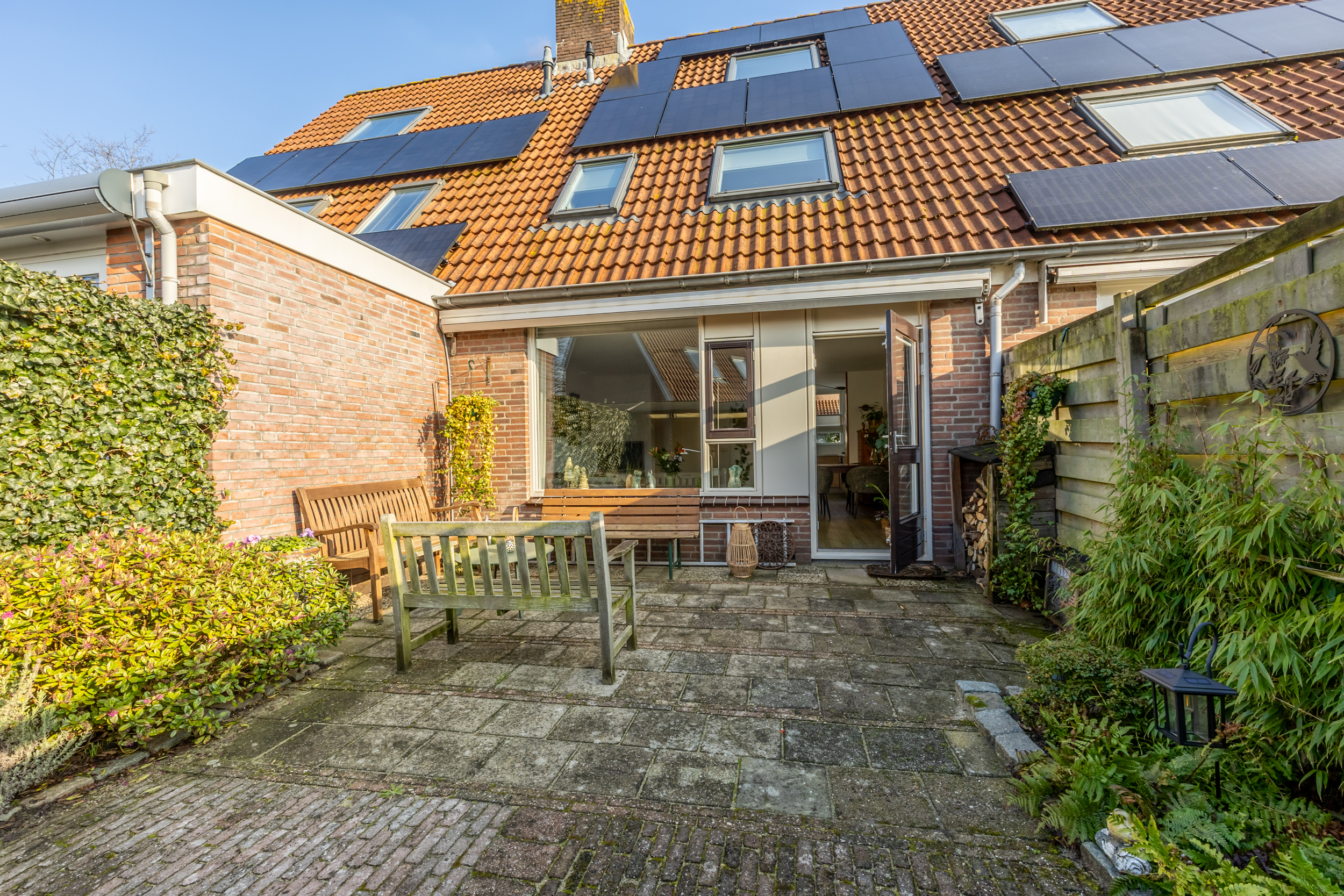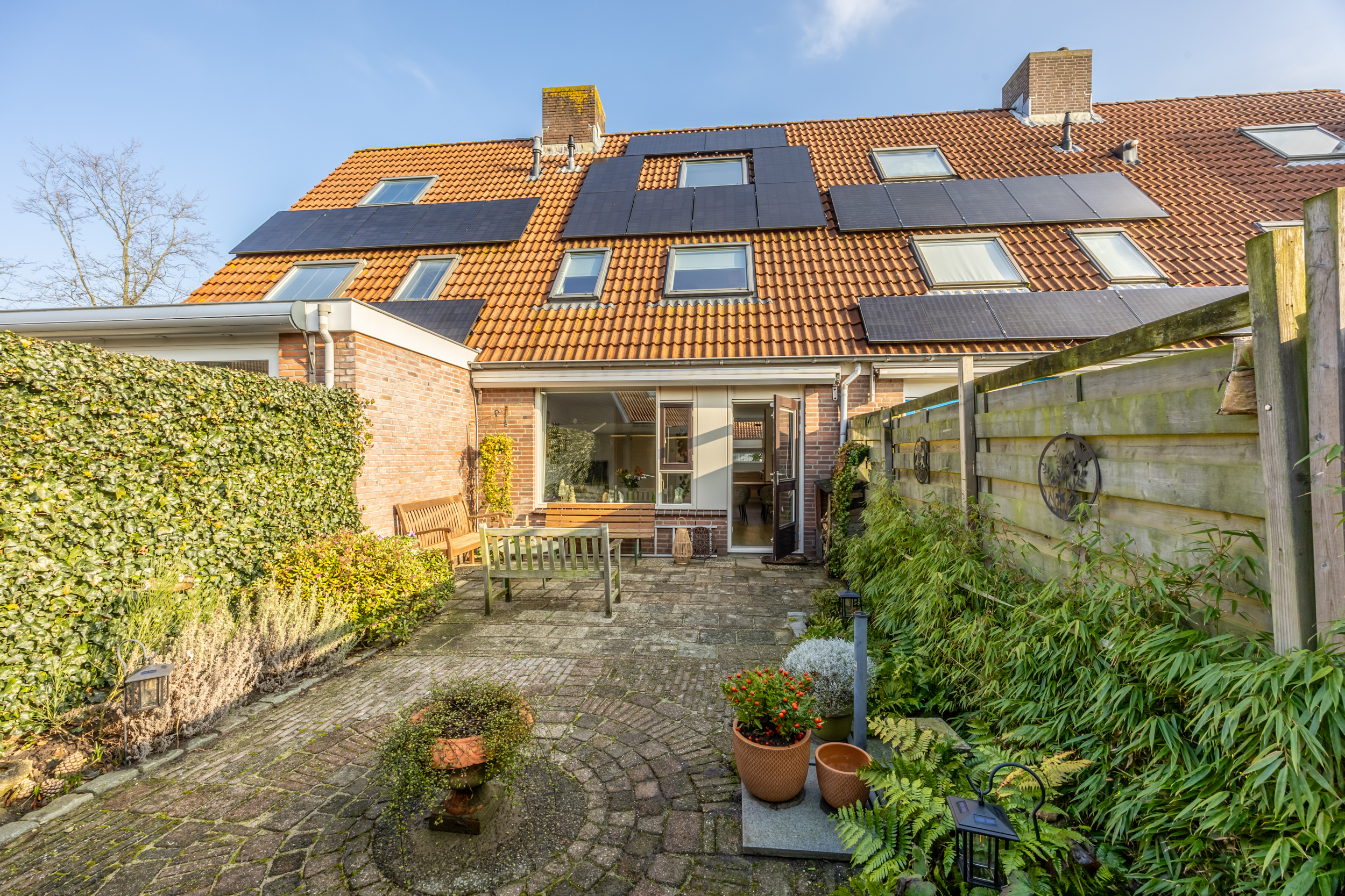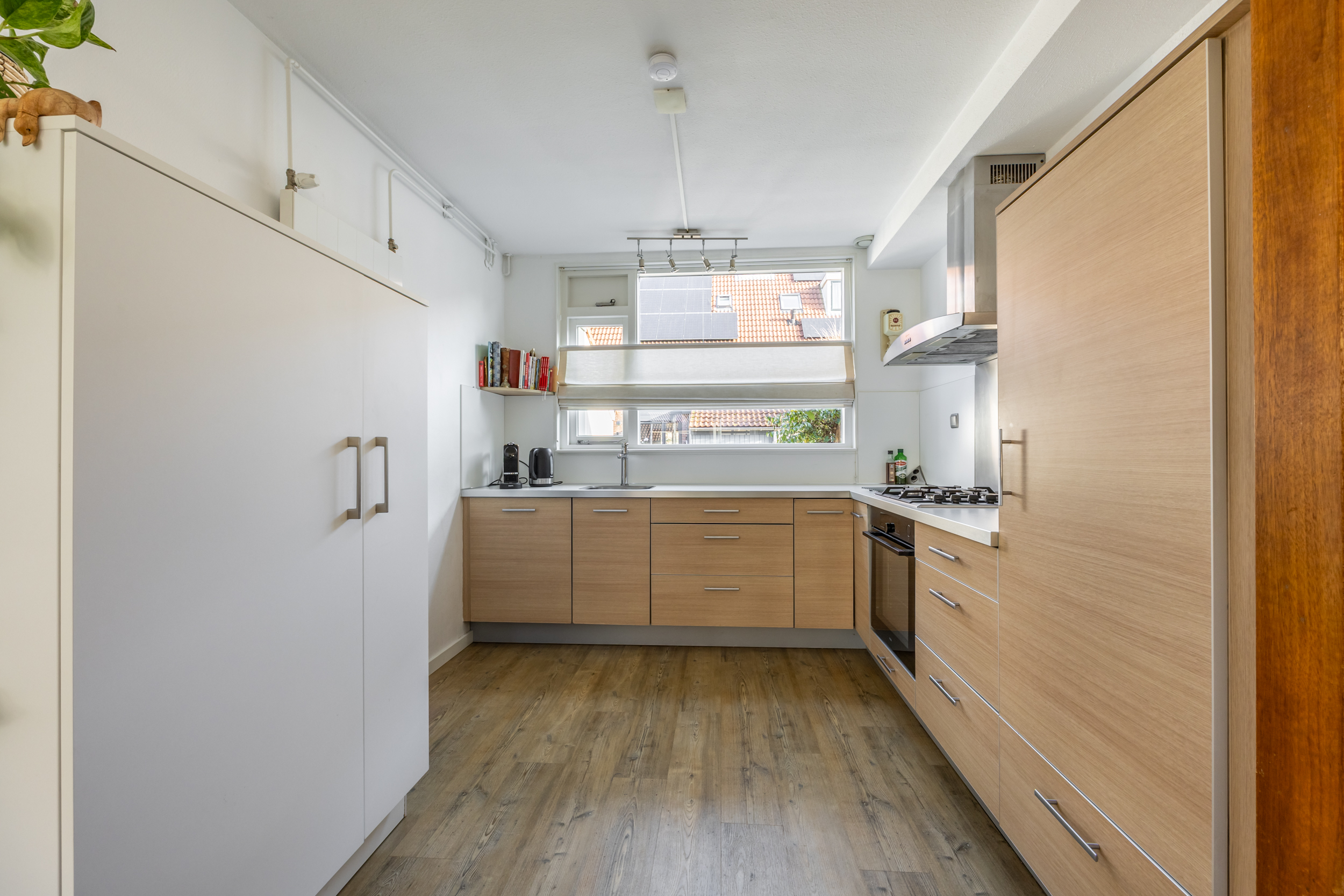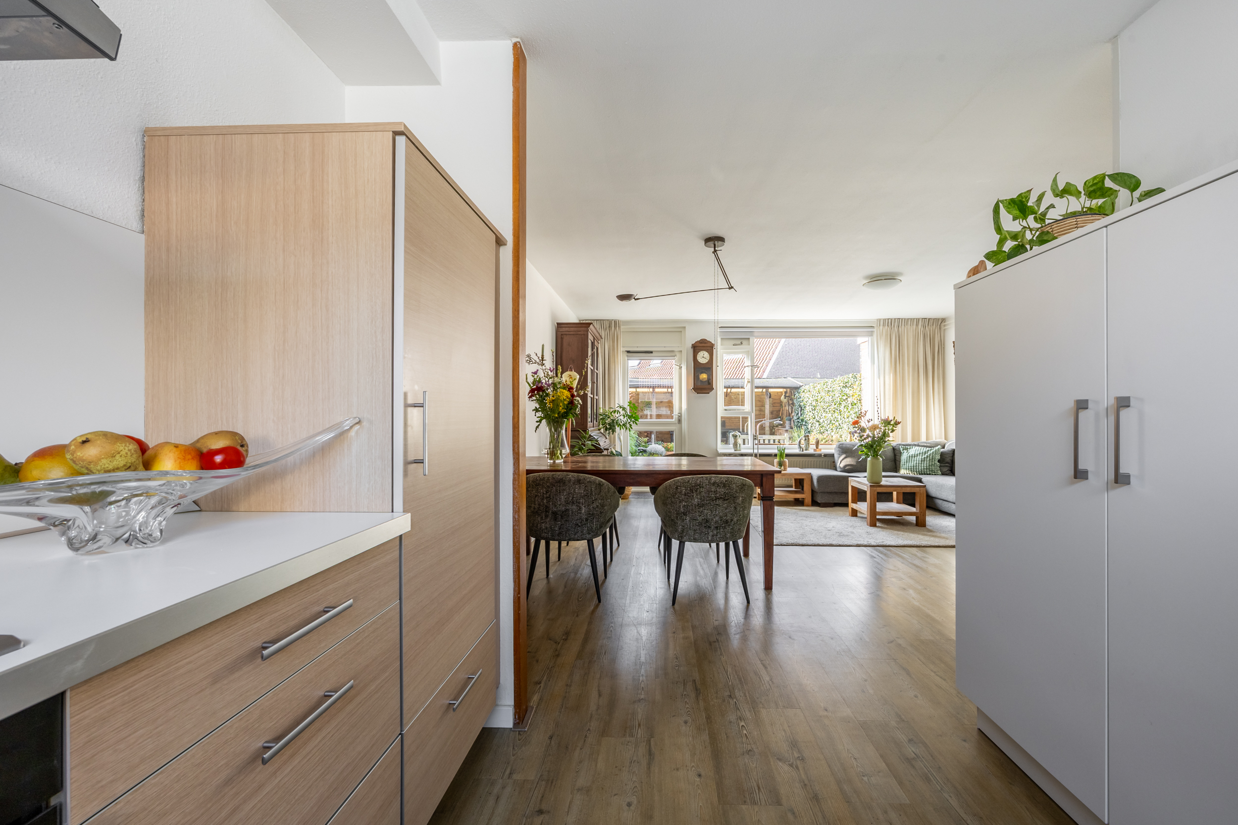 voorzijde. Qua apparatuur heb je de beschikking over een 4-pits gas kookplaat met RVS afzuigkap, een oven, een vaatwasser en een ingebouwde koelkast en vriezer. Vanuit de woonkamer loop je de zonnige achtertuin in met groot terras op het zuiden. Aan de voorzijde van de woning bevindt zich een ruime (fietsen) berging.