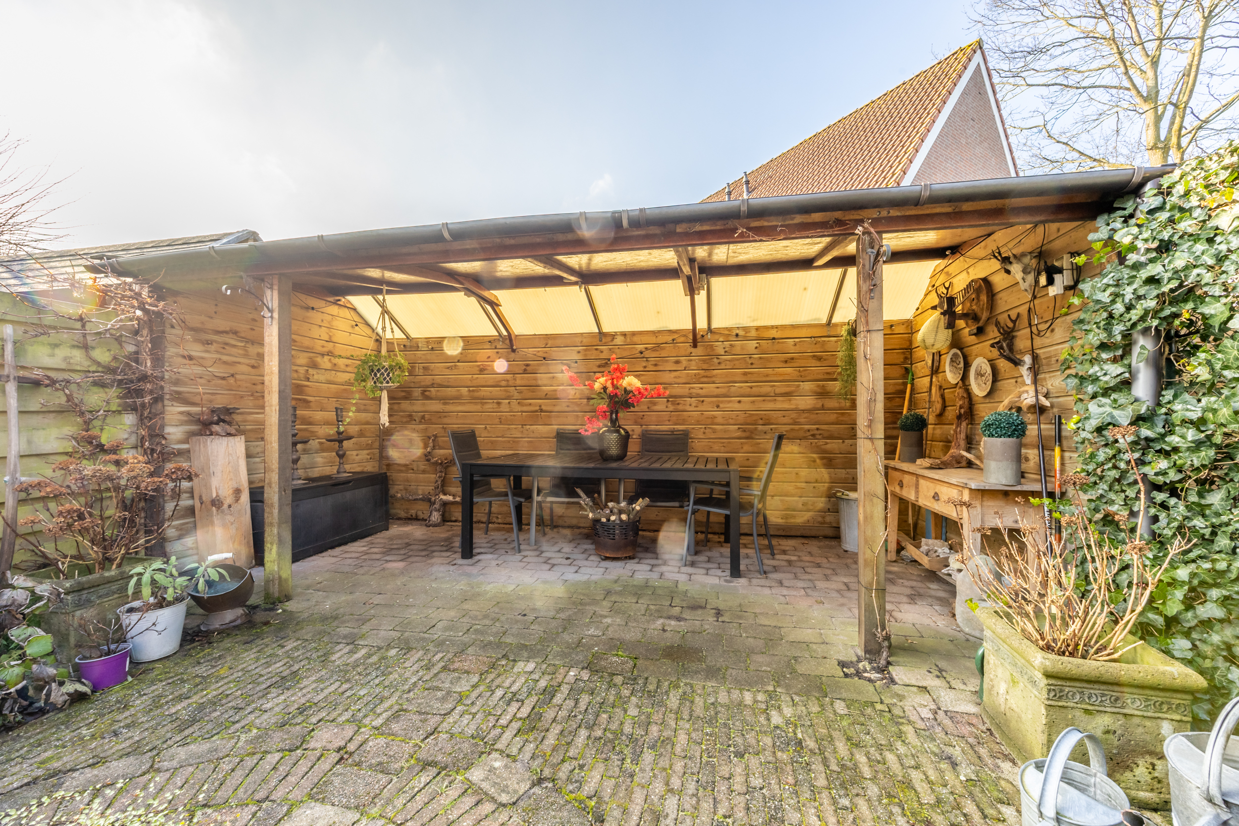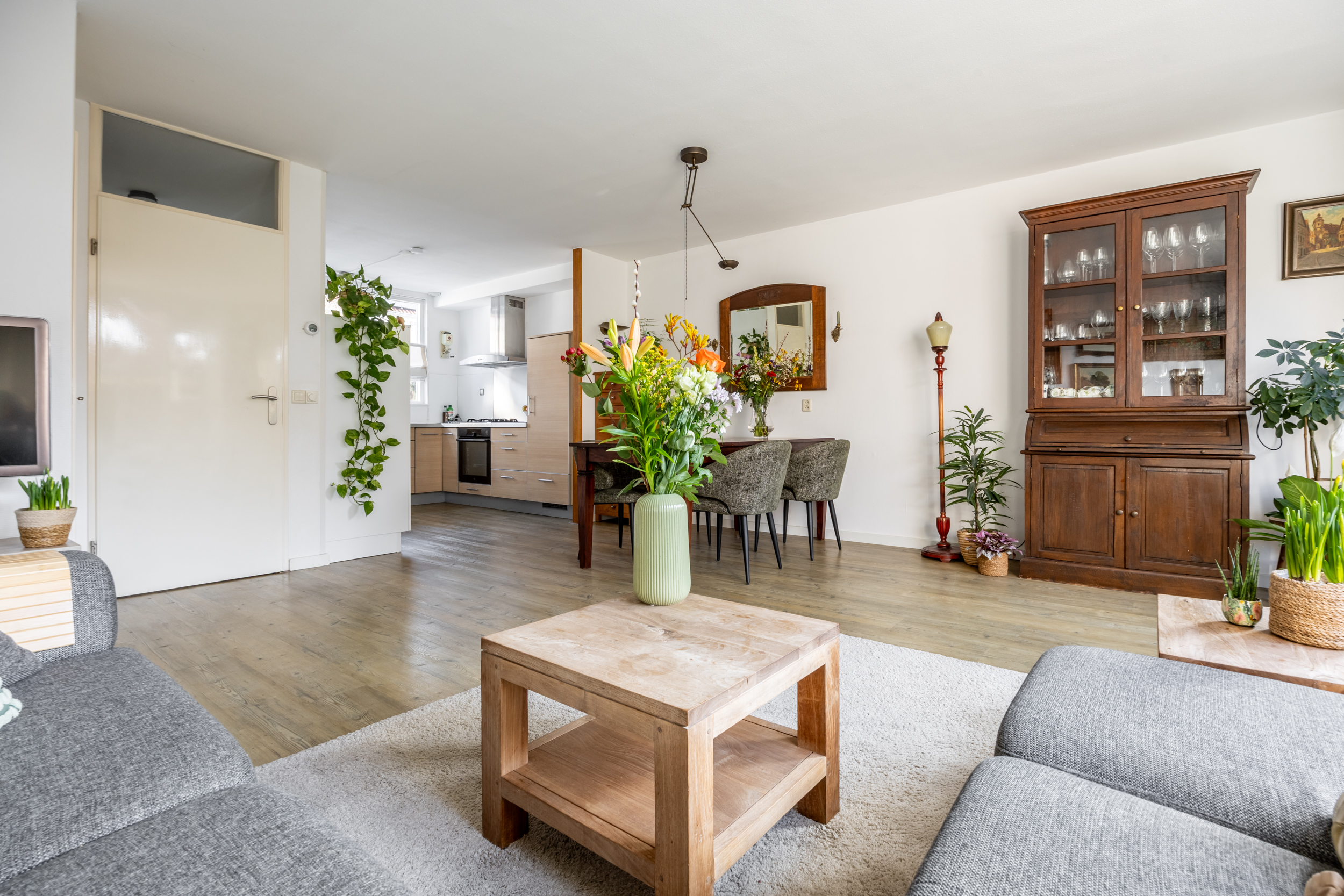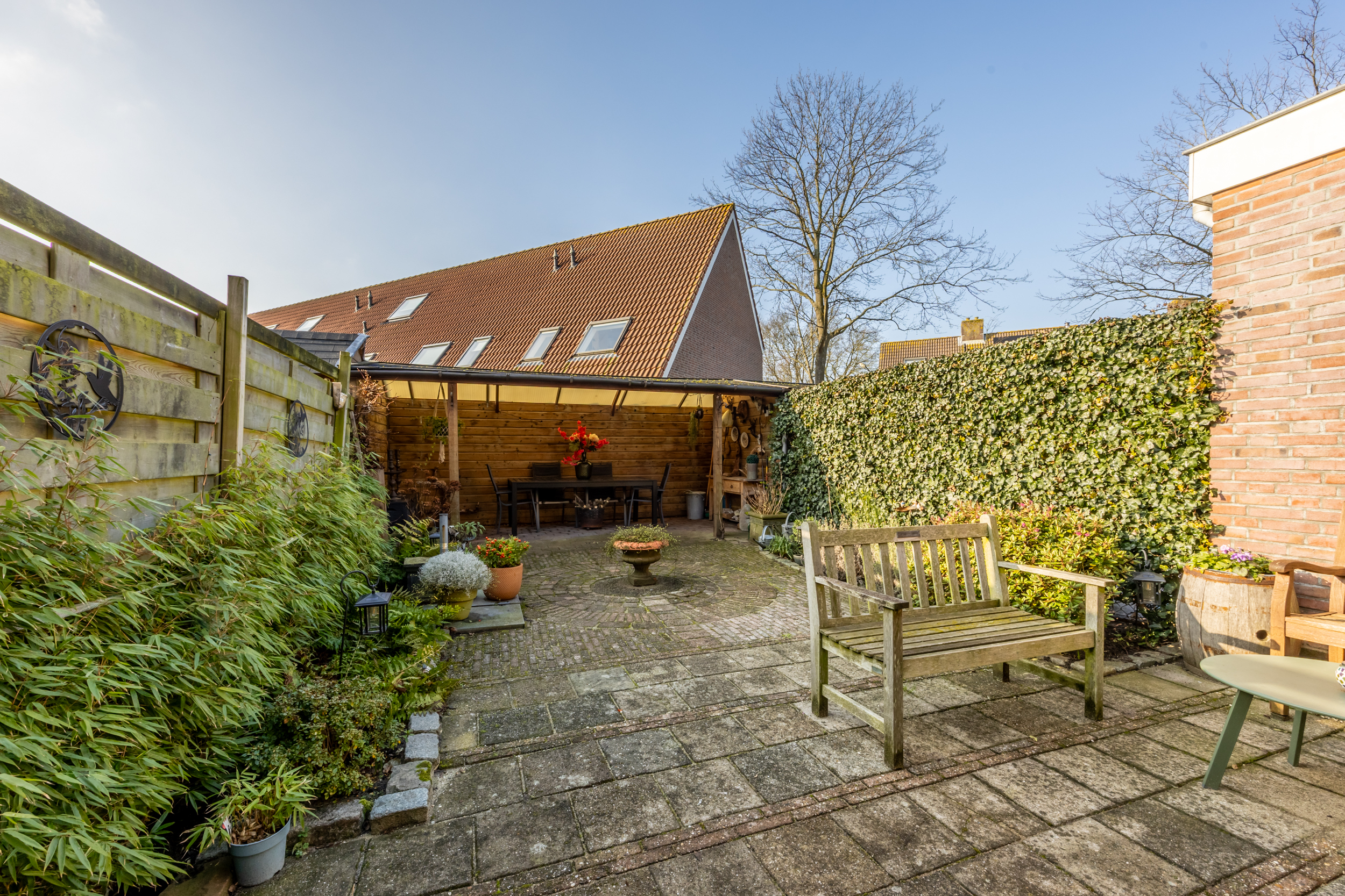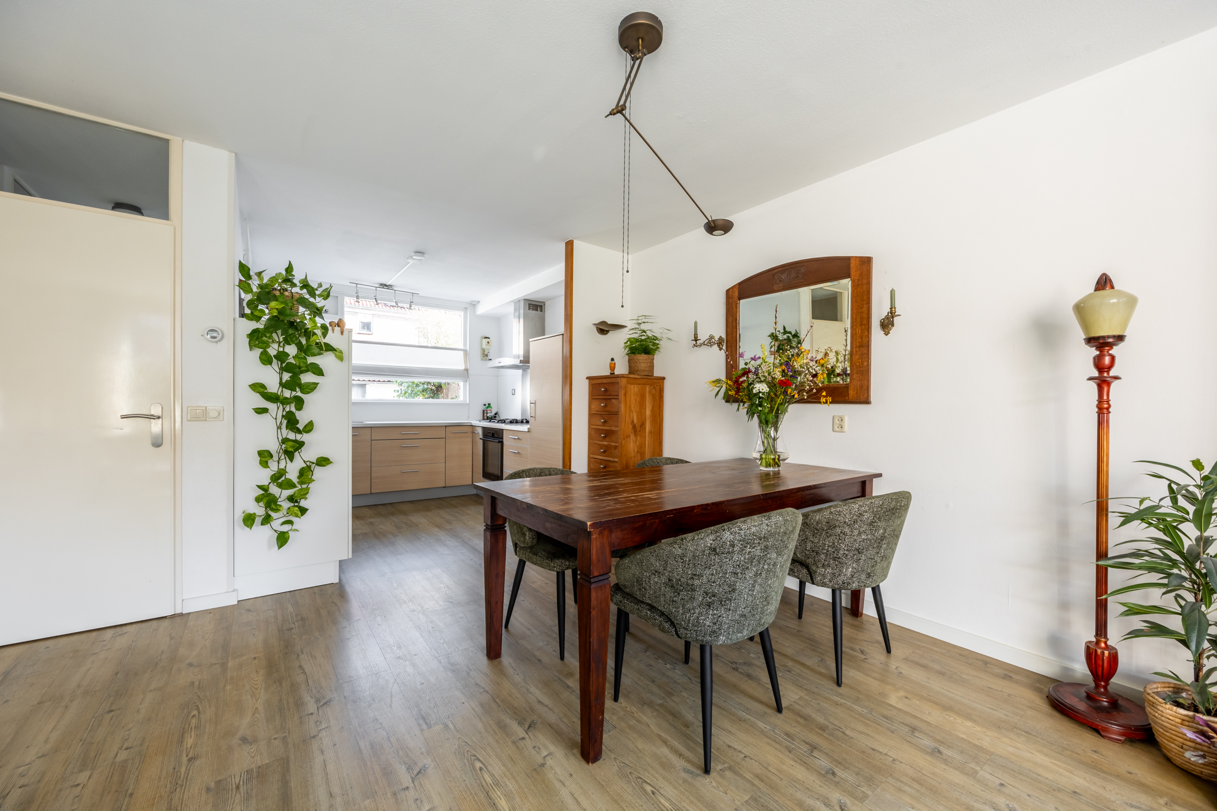 voorzijde. Qua apparatuur heb je de beschikking over een 4-pits gas kookplaat met RVS afzuigkap, een oven, een vaatwasser en een ingebouwde koelkast en vriezer. Vanuit de woonkamer loop je de zonnige achtertuin in met groot terras op het zuiden. Aan de voorzijde van de woning bevindt zich een ruime (fietsen) berging.