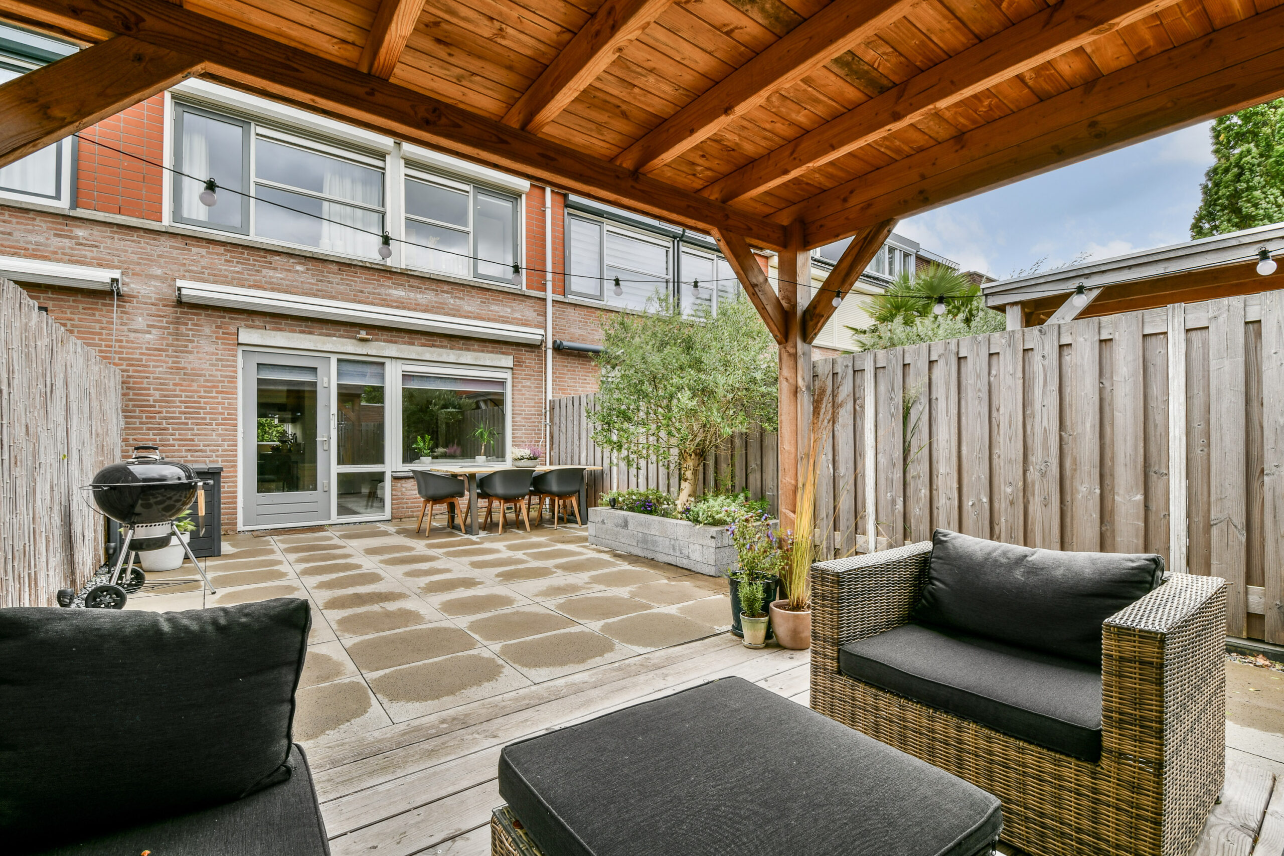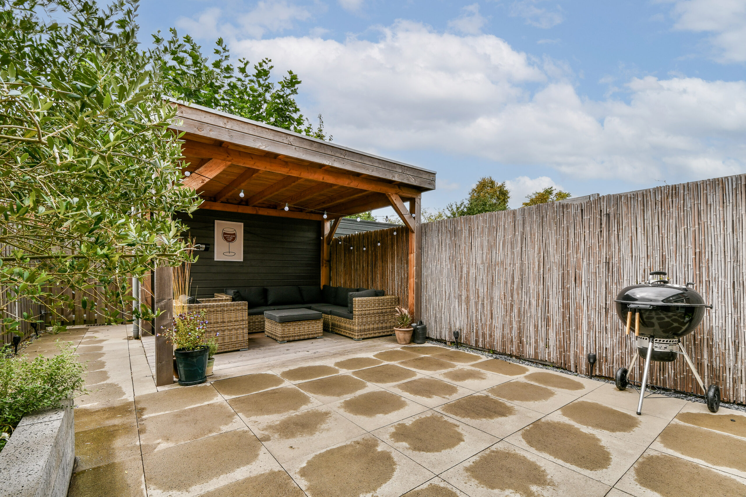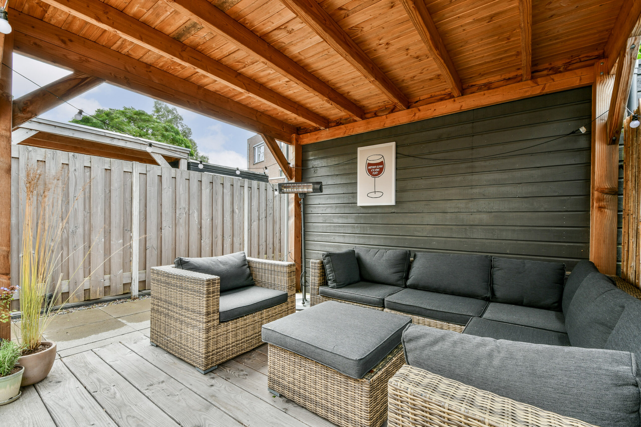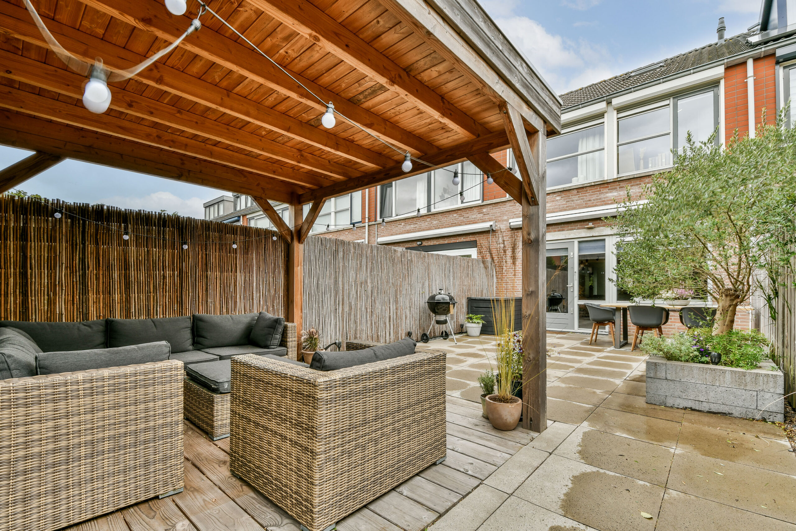 De ruime, zonnige achtertuin (ligging op het zuidwesten) is een echt verlengstuk van je woonkamer. Ideaal voor spelende kinderen, zomerse diners onder de veranda of een ontspannen middag in de zon. Achter in de tuin vind je een houten berging met elektra en een praktische achterom.