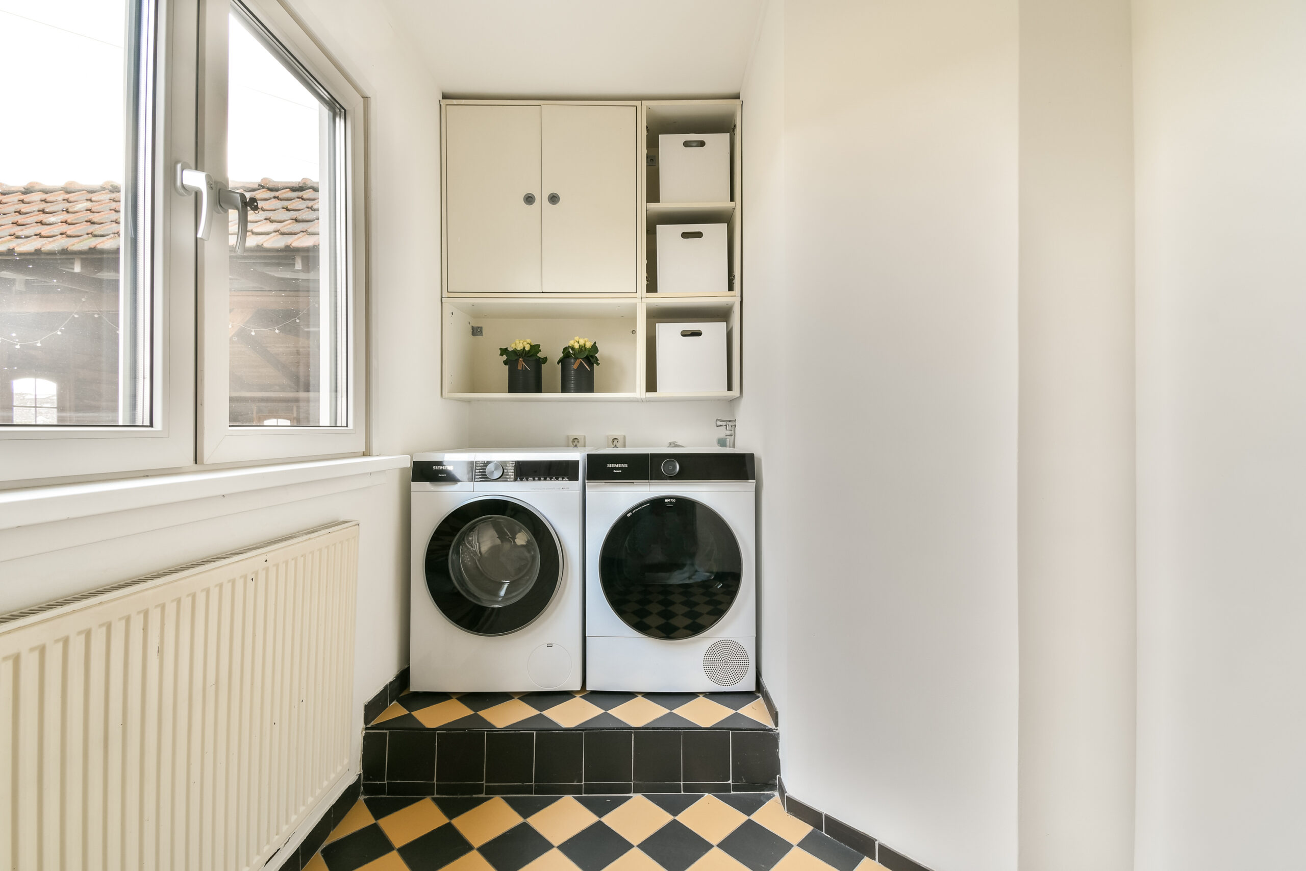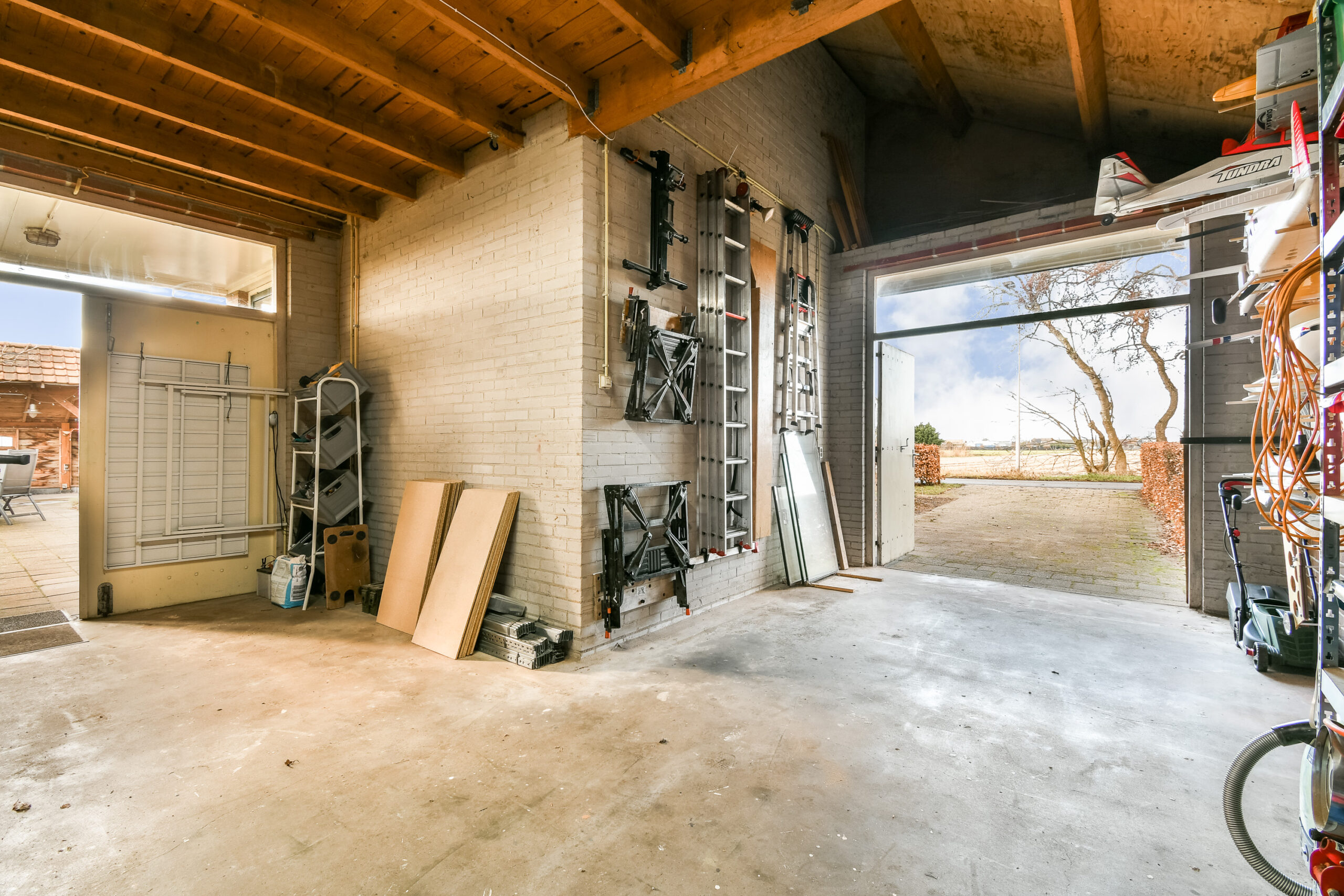 Er is een ruime garage/berging met vliering. Deze garage biedt zeer veel opbergruimte, maar is ook uitermate geschikt voor het beoefenen van hobby’s of het sleutelen aan motoren of auto’s.
