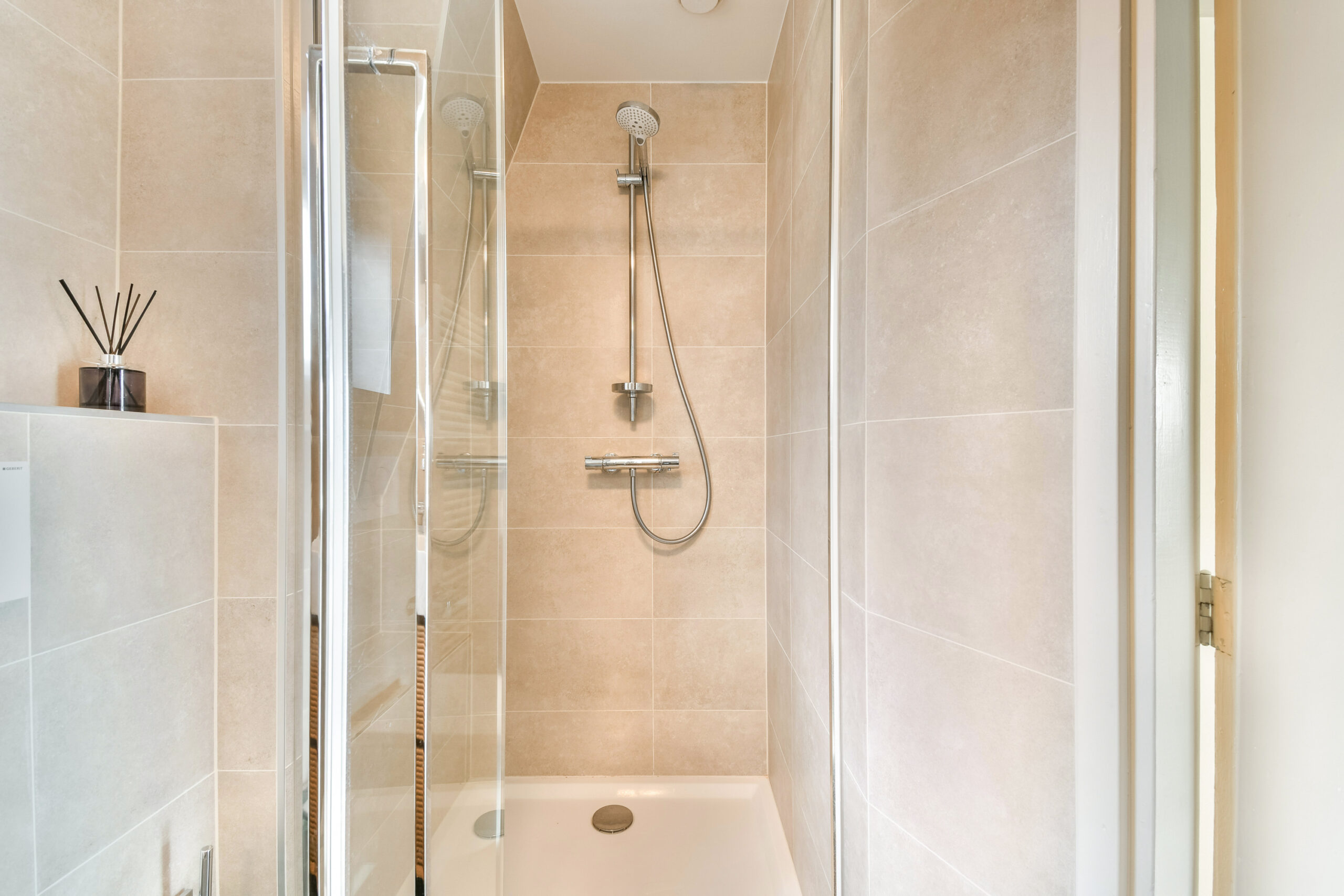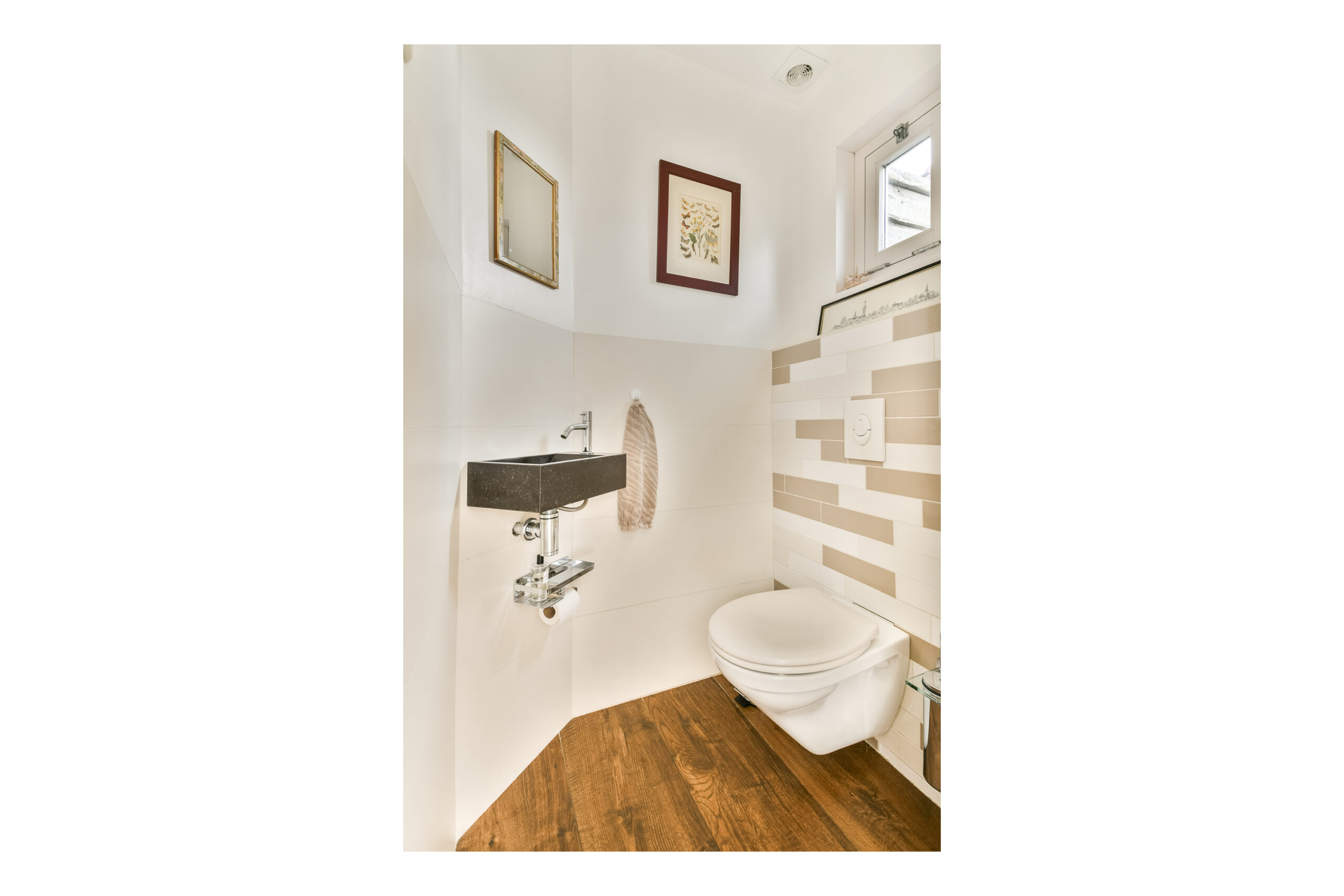 designradiator, wastafelmeubel en een grote ronde spiegel. De kleuren zijn mooi neutraal gehouden, wat zorgt voor een warme uitstraling.