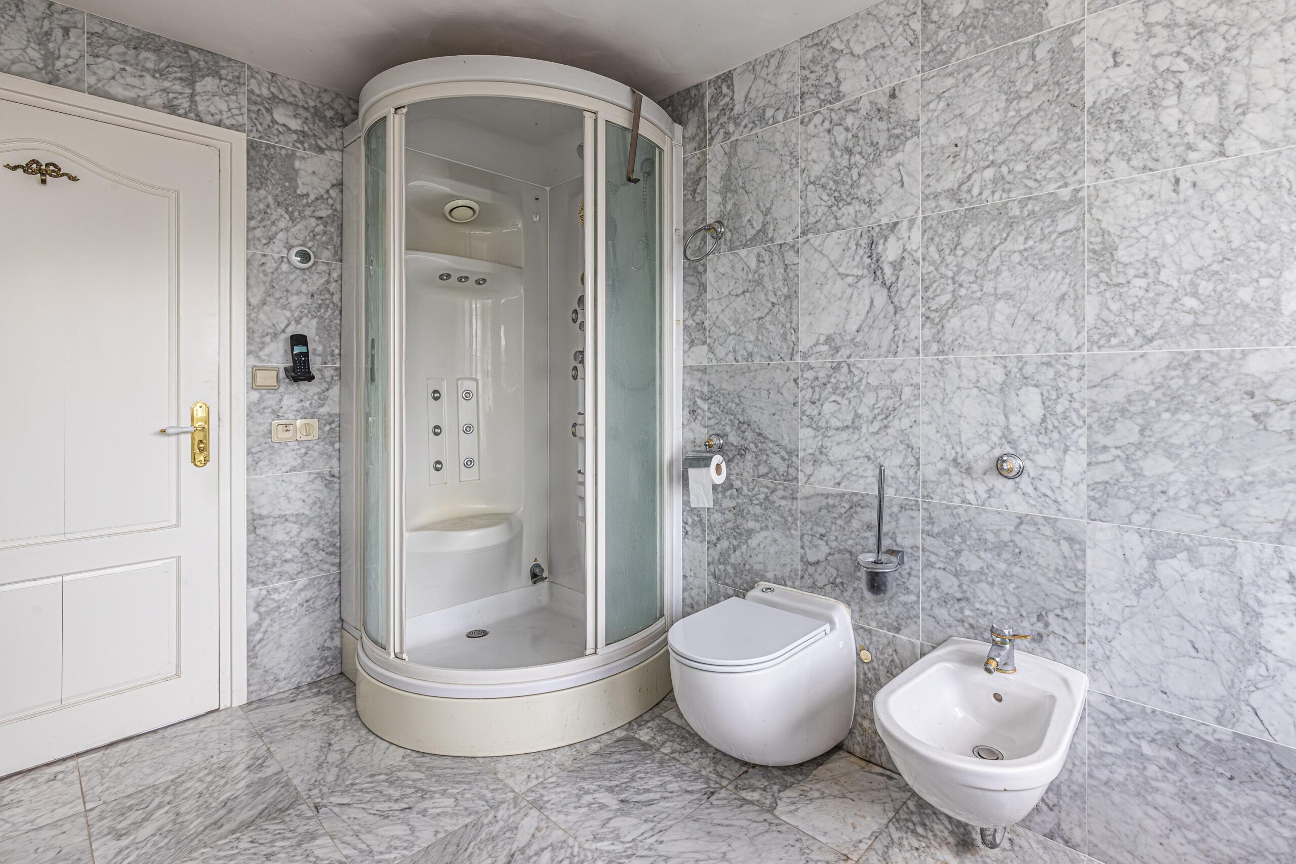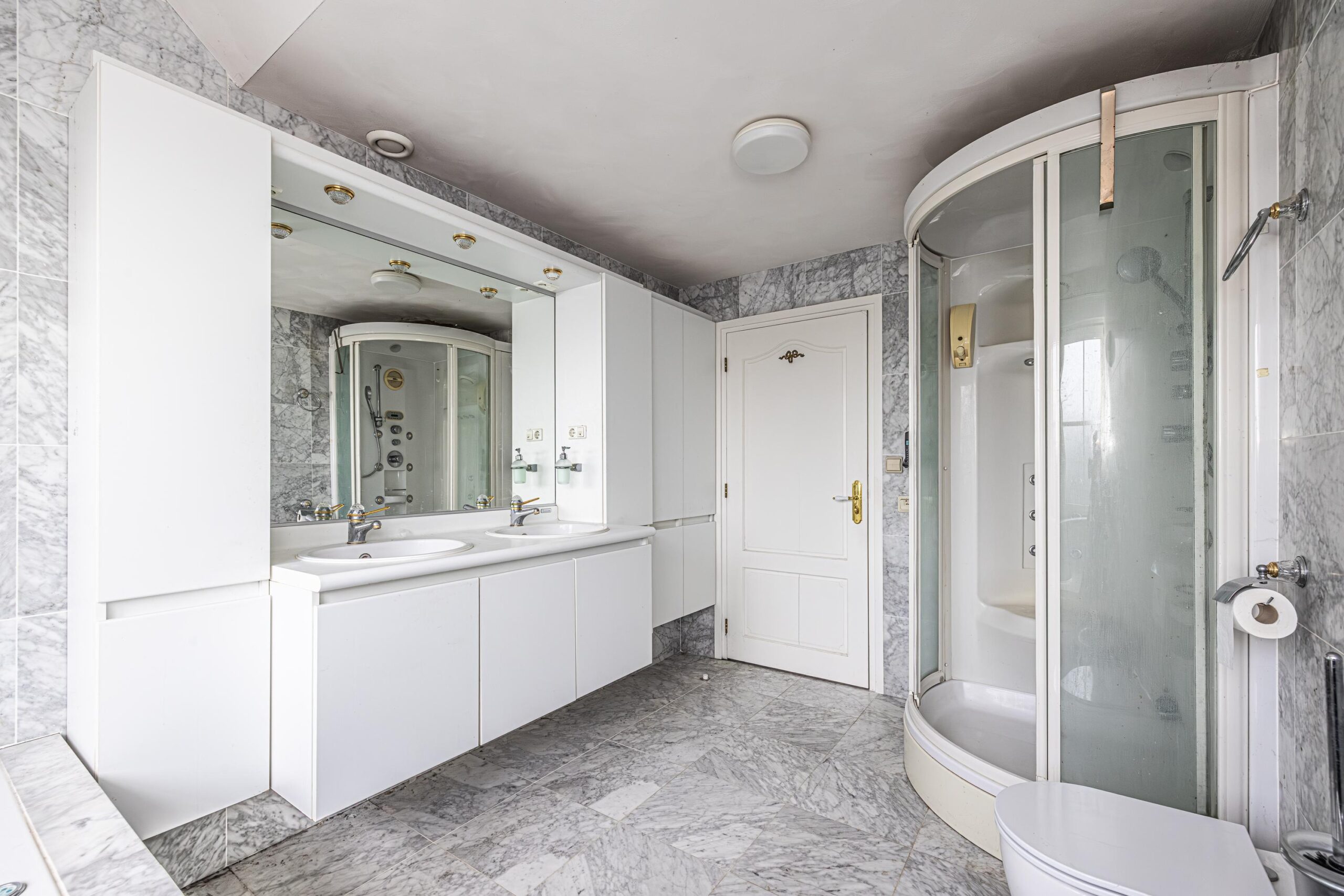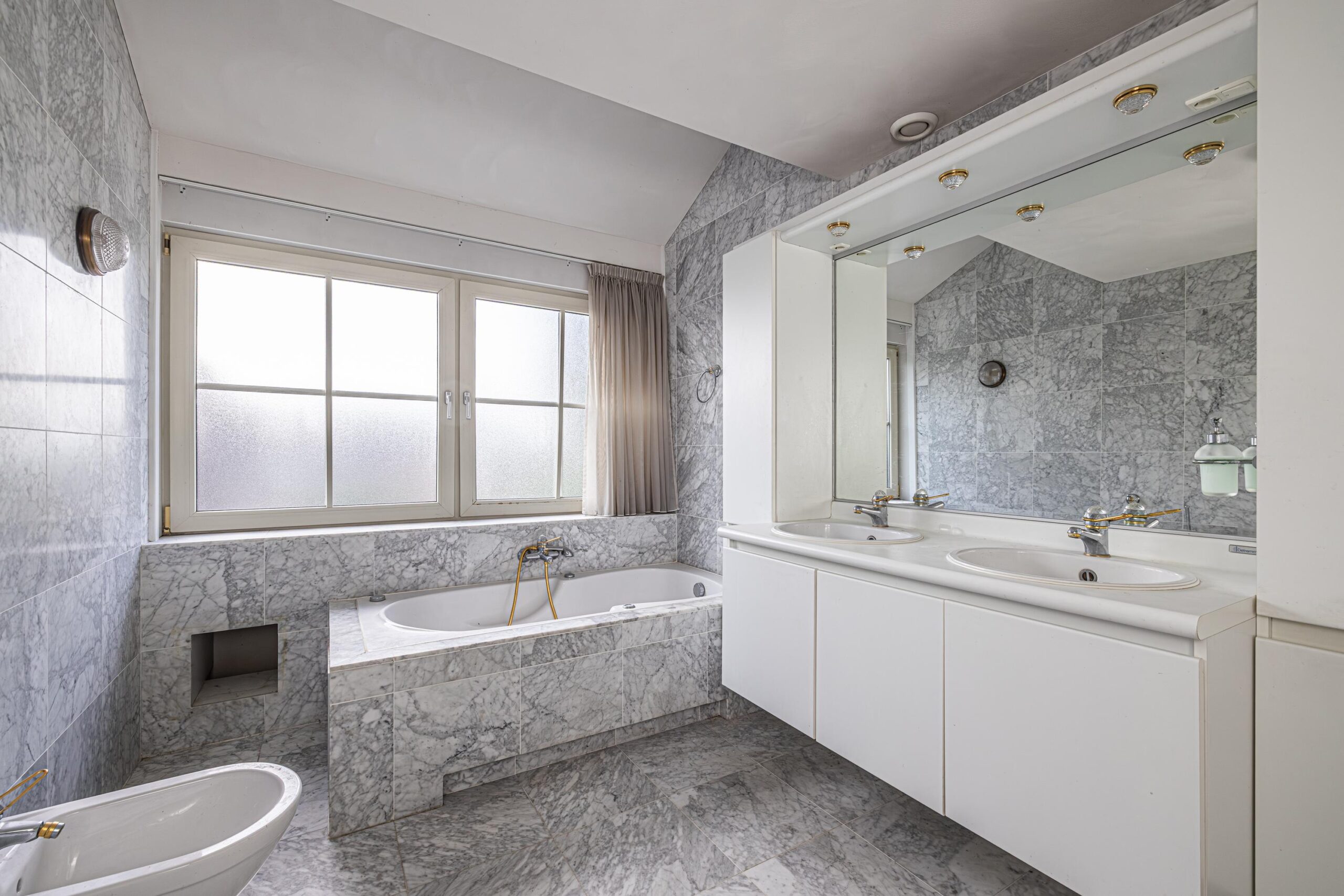 met een kunststof ligbad, aparte douchegelegenheid/stoomcabine met scherm, breed badmeubel met dubbele wastafel, een 2e toilet en daarnaast een bidet. De badkamer is heerlijk licht door de dakkapel en is voorzien van modern wit sanitair en marmeren vloer en wandtegelwerk.